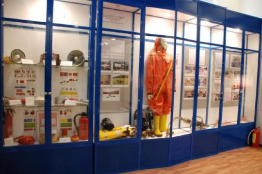 - зал с выставочными экспонатами поделен на сектора, посвященные различным темам – диаграмма крупнейшего пожара на нефтеперерабатывающем заводе, выставлены действующие макеты двадцатиэтажного дома, элеватора, школы, торговых комплексов, квартиры до и после пожара, а также фотографии с пожаров и обгоревшие телевизоры, обогреватели, разорвавшиеся газовые баллоны. В данном зале памяти погибших пожарных посвящена экспозиция;