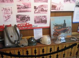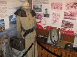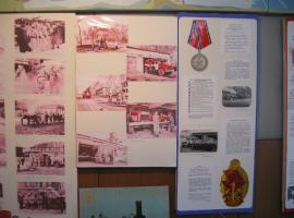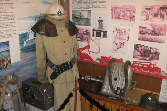Экспозиция состоит из: манекена в боевой одежде пожарного (боевка, пояс пожарного, краги, каска, сапоги); пожарный рукав со стволом «Б»; КИП-8; каска пожарного металлическая (покрашенная); каска пожарного металлическая (хромированная); каска пожарного пластмассовая (КП-80); топор пожарного в чехле – 2 шт.; стенды с фотографиями – 2 шт.; стенд ВДПО – 1 шт.; картина пожарного автомобиля – 1 шт. Площадь, занимаемая экспозицией, составляет 6 м2.