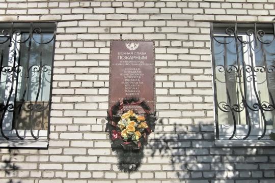 Текст на доске: "Вечная слава пожарным, погибшим в борьбе за независимость нашей Родины: Бураков А.Ф. Васильев А.И. Вознесенский В.Н. Заглядов П.Я. Иванов И.А. Калистратов П.Я. Копцов П.И. Моргун А.Г. Тальбах И.Д. Фадин Н.П. Героически погибли при ликвидации крупного пожара возникшего при налете вражеской авиации 14 октября 1941 года на железнодорожной станции Тихвин".