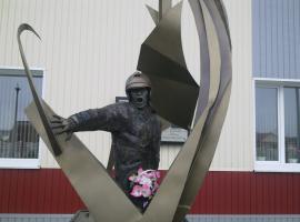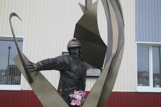Краткое описание - Композиция, отображающая трагичный эпизод ликвидации пожара –пожарный одного из расчетов на фоне фрагментов взорвавшегося резервуара №8. Птицы – души погибших огнеборцев, взмывающих к небу. Их – четыре, по числу ушедших ребят.