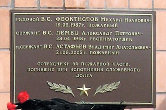 Мемориальная доска памяти погибших сотрудников 34-й пожарной части установлена 28.04.2008 г. на территории 34-й пожарной части.