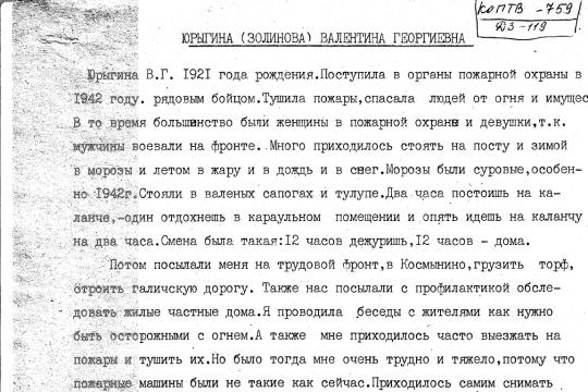 «В сорок первом Валентина Золинова (Юрыгина) работала на почте в родном Караваеве, клеила марки, разносила письма и телеграммы и думать не думала, что может быть иначе… На фронт семья Золиновых провожала сразу двоих из троих Валиных братьев. Старшего, Анатолия, оставили в городе – он был начальником караула центральной костромской пожарной охраны. Теперь брат время от времени заводил с сестрой один и тот же разговор: «Пойдём, Валь, к нам! У нас же все девчонки молодые работают». В 42-м Валентина поняла – пора внять уговорам брата. И Валентина стала бойцом второго отряда пожарной части номер один. Всего отрядов было три, в каждом – по семь бойцов, по семь девчонок. Брезентовые штаны, куртка, каска и ремень стали их второй кожей. «Самое трудное было стащить «рукава» с катушки. Там, где мужчина справлялся один, наши бойцы по двое». Один из самых страшных пожаров, оставшихся в памяти Валентины Георгиевны, - пожар в Никольской психиатрической больнице… Обезумевшие от ужаса пациенты были куда пострашнее самого огня, из которого их вытаскивали девчонки. И всё-таки была в жизни вещь, которой Валентина боялась по-настоящему. Этой вещью была пожарная каланча, та, которая стоит в самом центре Костромы. В те годы башня была главным дозорным местом в городе.