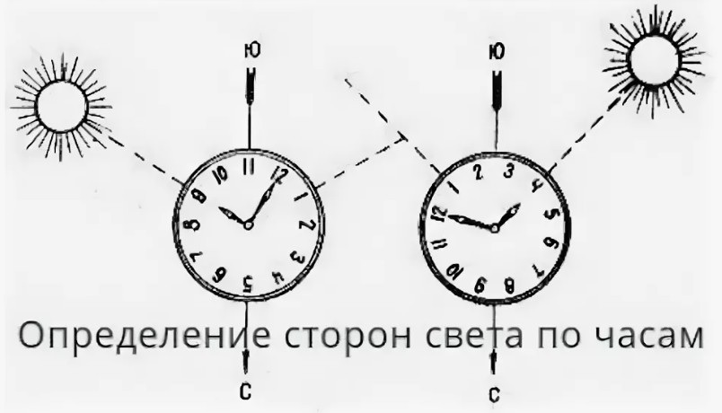Вращая часы в горизонтальной плоскости, направляют часовую (короткую) стрелку в сторону Солнца. Угол между часовой стрелкой и направлением на 14 часов (для России после безвозвратного перехода на летнее время в 2011 году) делится пополам. Эта линия и будет направлением на юг.