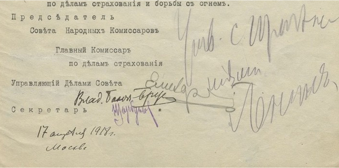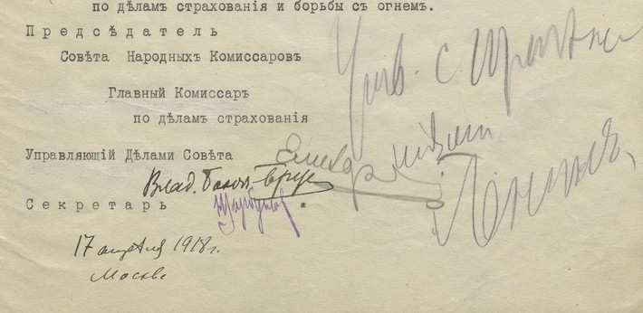 Решив обратиться к первоисточнику, я вновь обратился в Госархив РФ, и получил от них сканированную копию декрета «Об организации государственных мер борьбы с огнем» на 7 листах. Но подпись председателя совета Народных комиссаров В.И. Ленина была не той, которую мы привыкли видеть.
