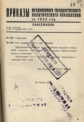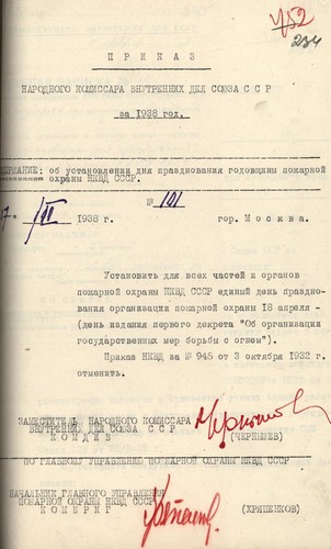 Через 6 лет дату празднования изменили. 17 февраля 1938 года заместитель народного комиссара внутренних дел СССР В.В. Чернышов подписал приказ № 101, который гласил: «Установить для всех частей и органов пожарной охраны НКВД СССР единый день празднования организации пожарной охраны 18 апреля – день издания первого декрета «Об организации государственных мер борьбы с огнем».