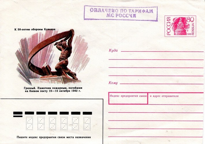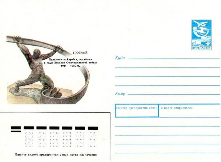 Единственным памятником, дважды напечатанном на конвертах, стал памятник в Грозном. Открытый в 1968 году, в честь пожарных, отражавших в 1942 году налеты немецкой авиации. За 5 дней бомбежек в городе произошло более 250 пожаров, при тушении которых погибло 15 пожарных. Памятник стал первым в стране памятником пожарным с вечным огнем.
