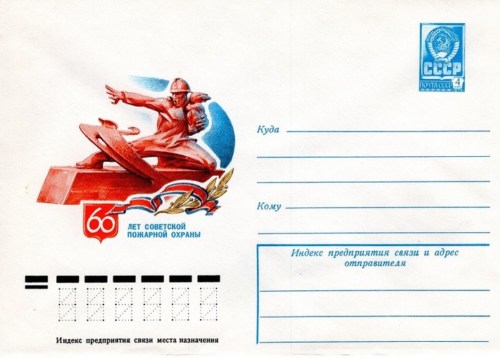 Впервые такой конверт был выпущен в октябре 1982 года. На нем изображен памятник в городе Горьком (ныне Нижний Новгород), который был открыт в день 60-летия советской пожарной охраны, 18 апреля 1978 года. В год открытия мемориальный комплекс был признан лучшим произведением искусства о деятельности органов внутренних дел. Позже, рядом с памятником появился мраморный постамент, на котором высечены имена всех пожарных региона, погибших при исполнении служебного долга, начиная с 1942 года.