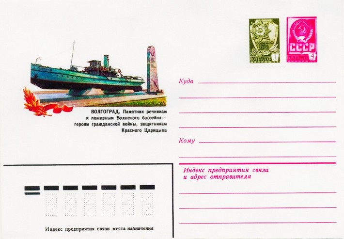 Единственным памятником, нашедшем отображение на почтовой маркированной открытке, стал памятник речникам и пожарным Волжского бассейна, установленный в Волгограде в ноябре 1977 года.