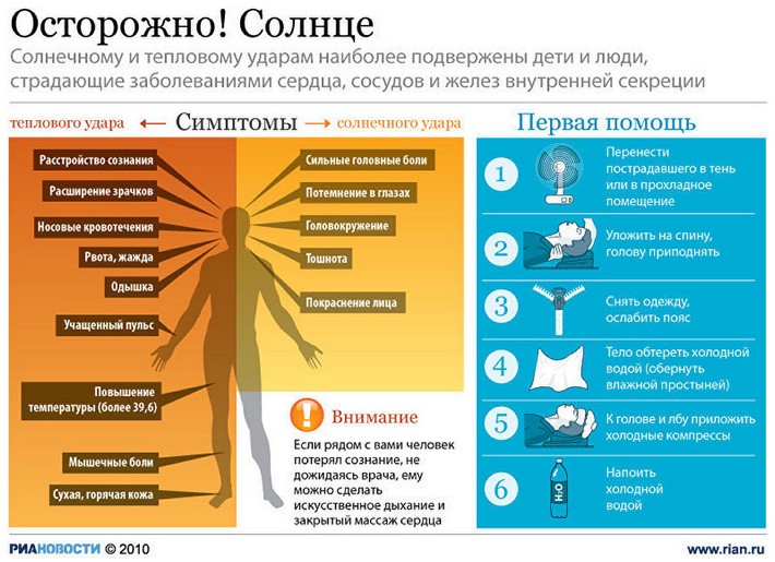 - Тепловой удар: высокая температура тела (выше 39°C), головная боль, головокружение, тошнота, рвота, учащенное сердцебиение и дыхание, слабость, сонливость, судороги, потеря сознания.