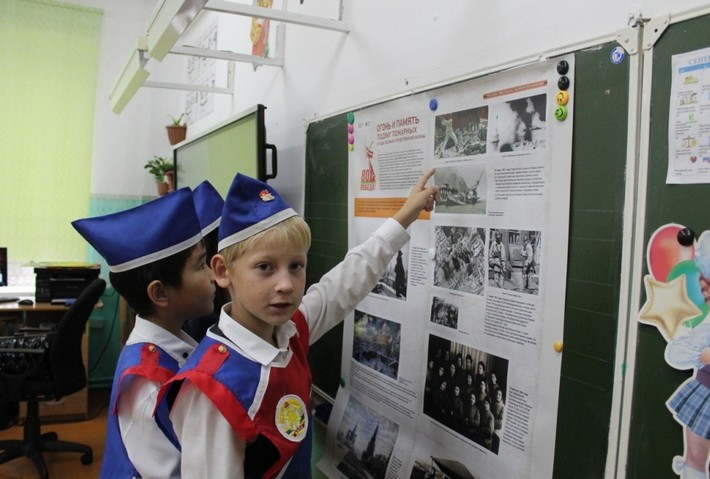 Первое занятие дружины юных пожарных «ДЮПята» в новом учебном году началось со знакомства ребят с подвигом огнеборцев в годы Великой Отечественной Войны. Заместитель председателя республиканского отделения ВДПО Людмила Кулаева познакомила ребят с мультимедийной экспозицией «Огонь и память», которая является не только констатацией фактов работы пожарных в годы ВОВ, а историей, позволяющей пережить драматические события того времени глазами тех, кто боролся с огнём, неся на своих плечах не меньший груз ответственности, чем солдаты на передовой.