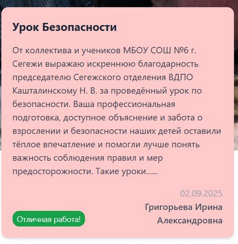 «Учитель основ безопасности и защиты Родины дает знания, за которыми стоит сохранение жизни и здоровья детей, - сказала представитель ВДПО, - и эти знания, навыки поведения в различных чрезвычайных ситуациях даются ребенку на всю дальнейшую жизнь».