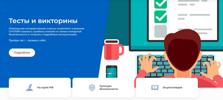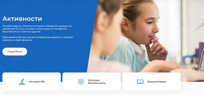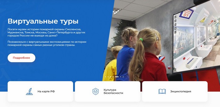 Более 110 онлайн-тренажеров по пожарной безопасности для детей от 6 до 14 лет размещено на портале. Интересны и содержательны виртуальные туры (60 туров) по музеям пожарной охраны в субъектах РФ (каждый в сопровождении аудиогида). Много интересного и полезного о пожарной охране, ее истории и проблемам безопасности можно узнать, проходя тесты и участвуя в викторинах (более 90 для начальной/средней/старшей школ).