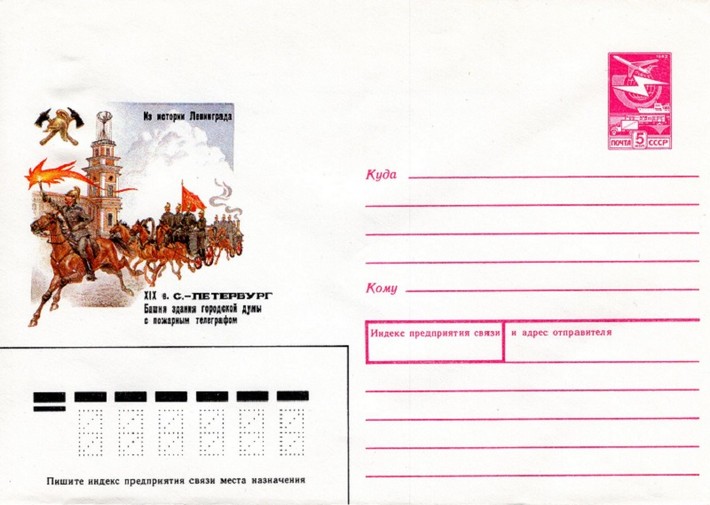 На конверте 1989 года, кроме Думской башне можно увидеть пожарный обоз, спешащий на пожар. Это единственное отображение старейшей в России пожарной команды Ленинграда – Санкт-Петербурга в филателии (не считая частных выпусков).