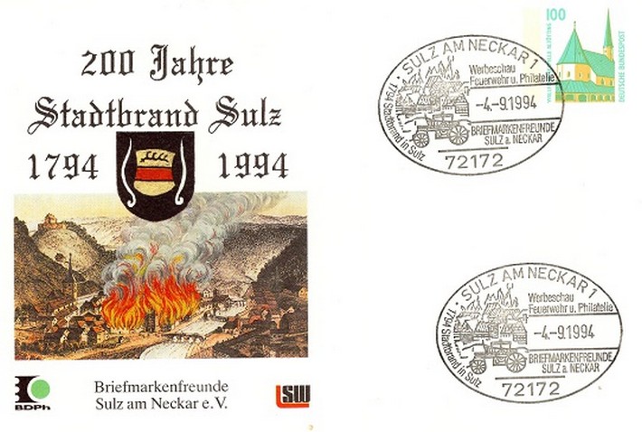 15 июля 1794 года немецкий город Зульц-ам-Неккар был практически полностью уничтожен пожаром. Огонь охватил весь средневековый центр внутри городских стен. После пожара город был полностью перестроен по единому плану. Именно тогда появилась нынешняя регулярная планировка старого центра и облик Рыночной площади с фонтаном (1807 г.), классическим брусчатым покрытием и зданием ратуши на сваях (1794-1819 гг.).