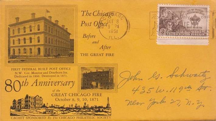 В октябре 1871 года в Чикаго случился пожар, который позже назовут «Великим Чикагским пожаром». Пожар начался вечером 8 октября 1871 года. По наиболее известной версии, пожар вызвала корова, опрокинувшая копытом керосиновую лампу. Вскоре пламя перекинулось на близлежащие постройки и дома. Сильный ветер относил огонь к центру города. Плотно стоящие деревянные дома, пришвартованные вдоль реки корабли, деревянные тротуары, угольные склады способствовали быстрому распространению огня.