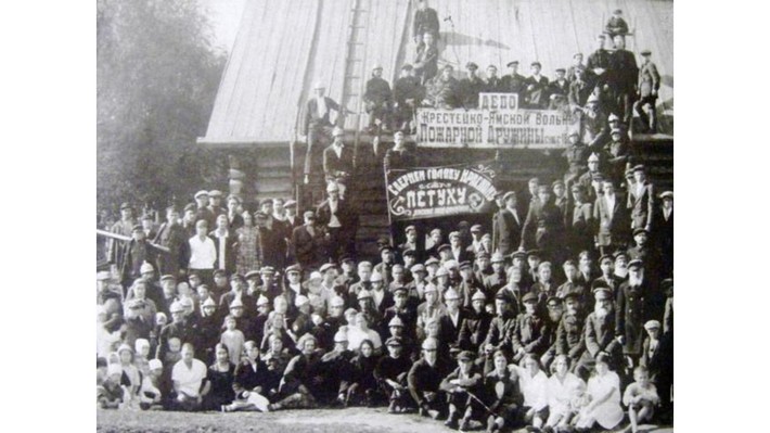 На фотографии изображена Крестецко-Ямская Вольно-Пожарная дружина Новгородкой области (виртуальный тур доступен здесь). Сумма цифр в подписи – 43.