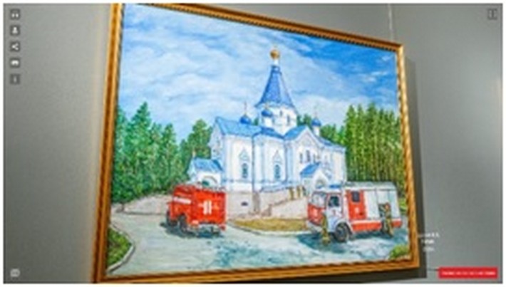 В музее специальной пожарной охраны г. Сергиев Посад (виртуальный тур доступен по ссылке) найдите картину «Учение». Какая цифра написана белой краской на пожарной машине?
