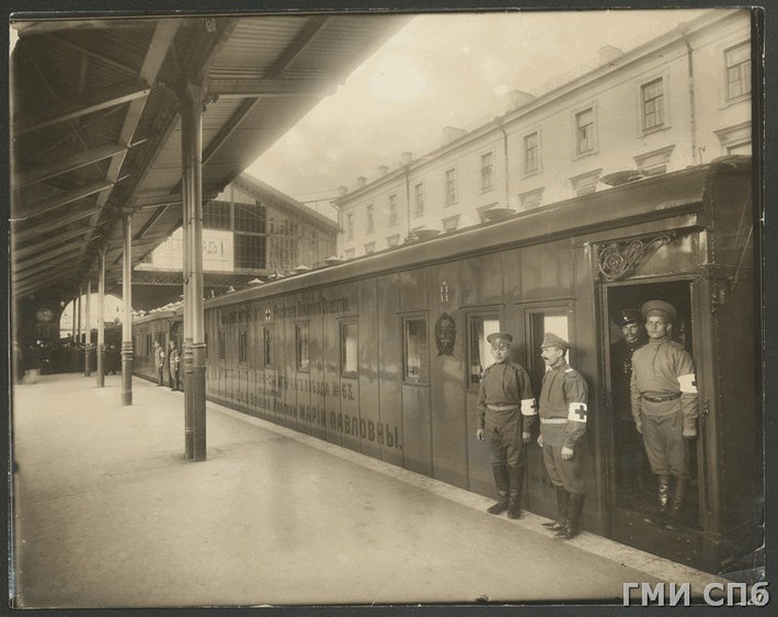 На фотографии изображен военно-санитарный поезд №63, который ранее был Всероссийской передвижной пожарной выставкой. Ее открытие состоялось на перроне Варшавского вокзала, архитектором которого был К.А. Скаржинский. Он также спроектировал здание второй пожарной части Казани. Наибольший номер маршрута автобуса на ближайшей остановке – 91.