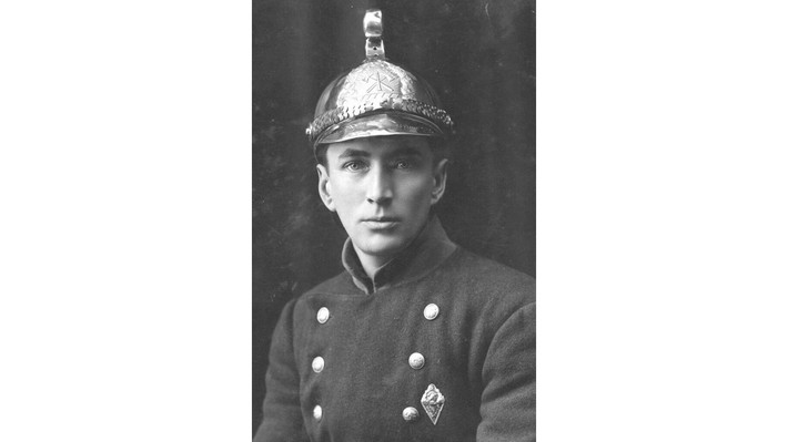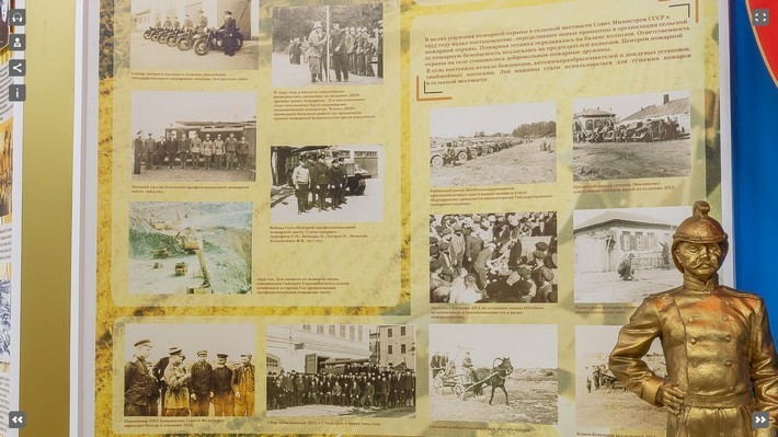 На фотографии изображен брандмайор Г.И. Дуров. На картине в экспозиции Пожарно-технической выставки Костромской области представлен оформленный им альбом. В картине над стендом с этим альбомом 5 пожарных касок.
