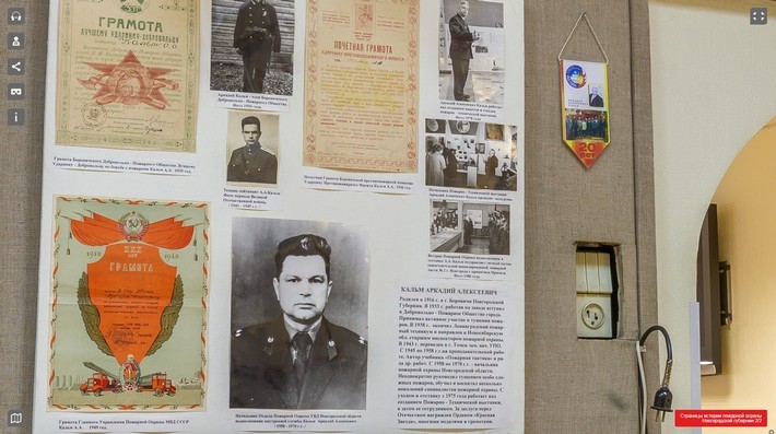 В экспозиции Пожарно-технической выставки Костромской области (виртуальный тур доступен на портале вдпо.рф) найдите альбом, оформленный человеком на фотографии. Над стендом, в котором он размещен, расположена картина. Сколько пожарных касок изображено на этой картине?