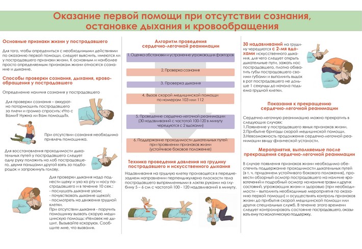 При отсутствии дыхания вызвать скорую медицинскую помощь (по тел. «03», «103» или «112»), позвать на помощь с целью привлечь внимание окружающих граждан и приступить к проведению сердечно-легочной реанимации путем чередования: давления руками на грудину пострадавшего и искусственного дыхания «рот ко рту» с использованием устройств для искусственного дыхания.