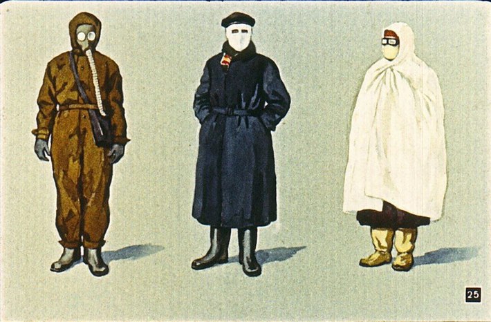 Обеспечить все население нашей страны противогазами и комплектами химической защиты, а также своевременно освежать эти запасы – колоссальная задача, на осуществление которой не был готов даже Советский Союз. Именно поэтому вопросы изготовления простейших средств защиты и модификации предметов гардероба были неотъемлемой частью всеобщего обязательного минимума знаний по ГО. Еще со школьной скамьи всех советских граждан учили шить специальные тканевые маски и пропитывать лыжные костюмы пастой из наструганного хозяйственного мыла. Эти импровизированные средства защиты могли дать где-то призрачный, а где-то вполне реальный шанс спасти людей от поражения и гибели.