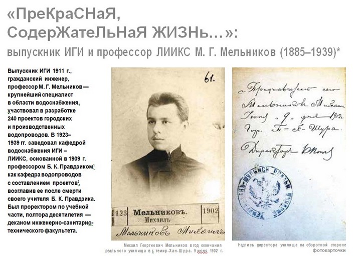 К сожалению, материалов о профессоре Мельникове и его научно-педагогической деятельности очень мало. Удалось найти только небольшой очерк в журнале Санкт-Петербургского государственного архитектурно-строительного университета «МастерОк» №1(16) за 2018 год. Автор документального очерка – внучка профессора Г.Ю. Мельникова, учитель русского языка и литературы.