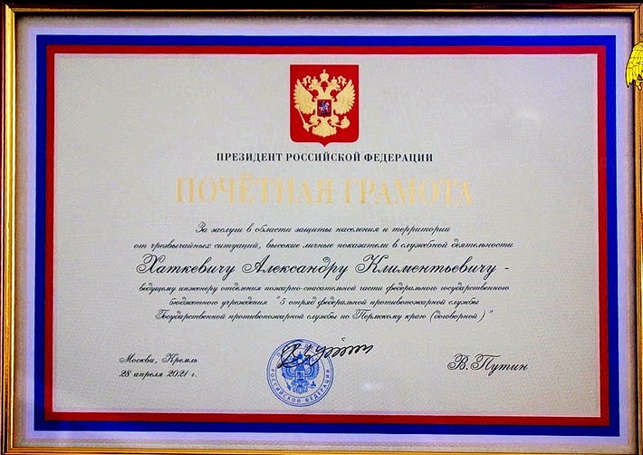 В 2021 году за заслуги в области защиты населения и территорий от чрезвычайных ситуаций, высокие личные показатели в служебной деятельности Президент Российской Федерации наградил Александра Хаткевича Почётной грамотой.