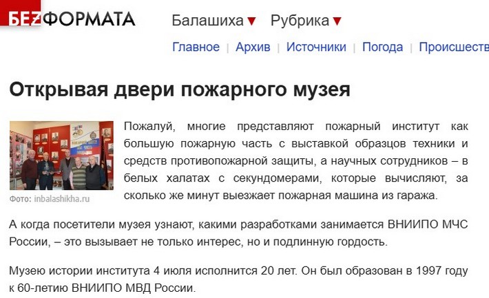Интернет-издание БеzФормата 4 июля 2017 года выпустило корреспонденцию Инны Серегиной «Открывая двери пожарного музея». Автор пишет:
