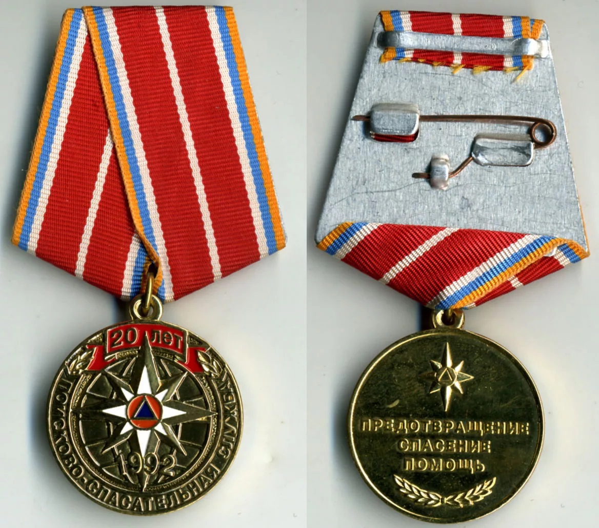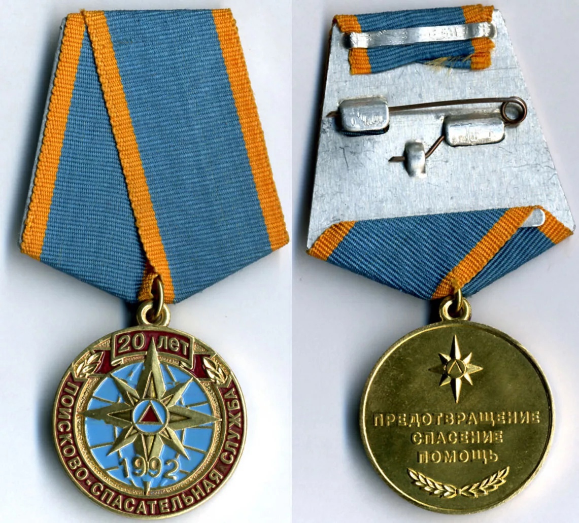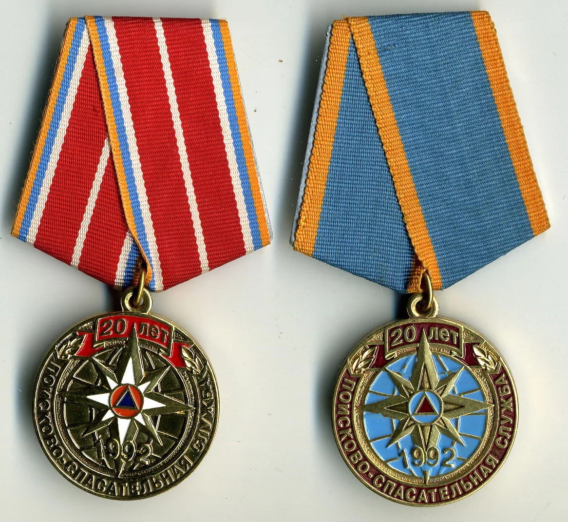 На изображении представлены две медали, посвященные 20-летию Пожарно-спасательной службы. Медали выполнены из металла и имеют круглую форму. На лицевой стороне каждой медали изображена восьмиконечная звезда с центральным элементом в виде треугольника, окрашенного в красный и синий цвета. Вокруг звезды расположены надписи на русском языке: "20 лет" и "1992". В нижней части медали выгравировано "ПОЖАРНО-СПАСАТЕЛЬНАЯ СЛУЖБА".