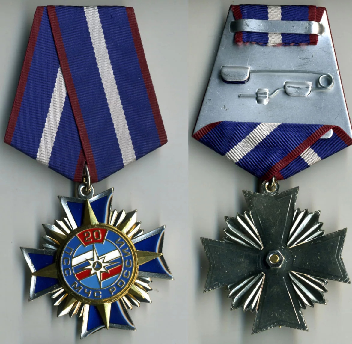 На изображении представлены две стороны одной медали, посвященной 20-летию ПСС МЧС России. Медаль имеет форму креста с синим эмалевым покрытием. В центре креста изображена эмблема МЧС России, состоящая из звезды, крыльев и щита с красным кругом и белой полосой. По краям креста расположены надписи "1992" и "2012", обозначающие годы, а также текст "ПОЖАРНО-СПАСАТЕЛЬНАЯ СЛУЖБА МЧС РОССИИ" и "20 ЛЕТ". Медаль прикреплена к ленте синего цвета с белыми и оранжевыми полосами. На обратной стороне медали виден металлический крепежный механизм и текстура металла.