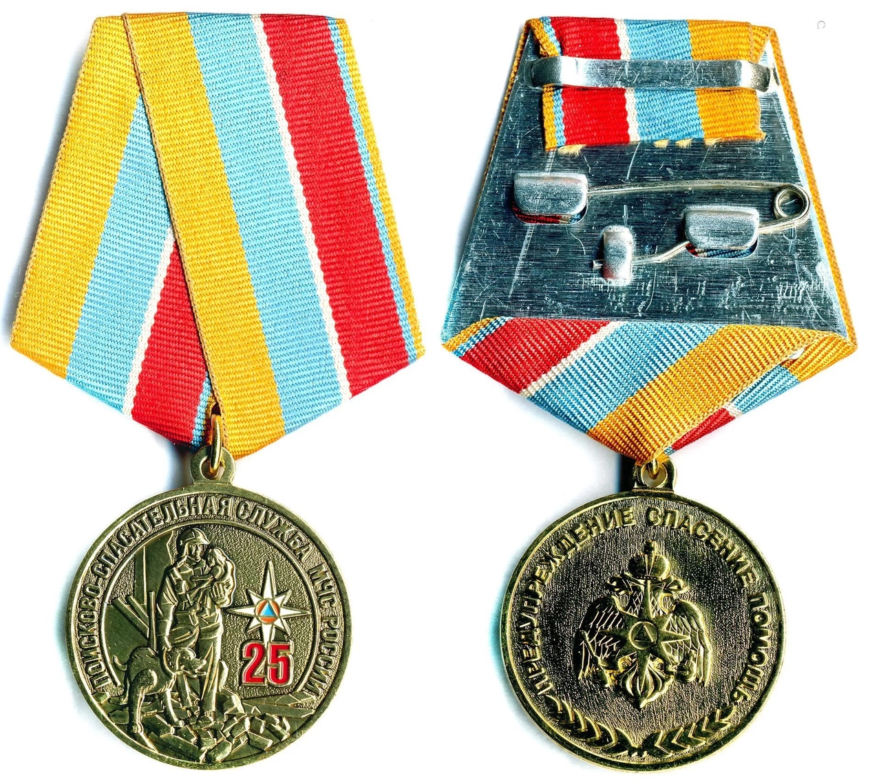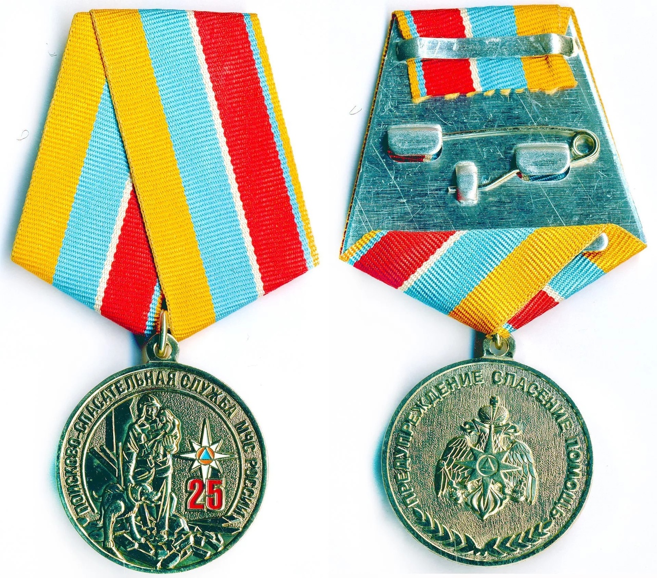 На изображении представлены две стороны одной медали, посвященной 25-летию Поисково-Спасательной Службы МЧС России. Медаль изготовлена из металла и имеет форму круга. На лицевой стороне изображен спасатель с собакой на фоне звезды и развалин, что символизирует героизм и самоотверженность спасателей. Вокруг изображения расположена надпись "25 лет ПОИСКОВО-СПАСАТЕЛЬНАЯ СЛУЖБА МЧС РОССИИ". На оборотной стороне медали изображен герб МЧС России, окруженный лавровыми ветвями, что символизирует честь и заслуги. Медаль прикреплена к ленте, состоящей из полос красного, желтого и голубого цветов, что соответствует цветам флага России и символизирует патриотизм и службу Родине.