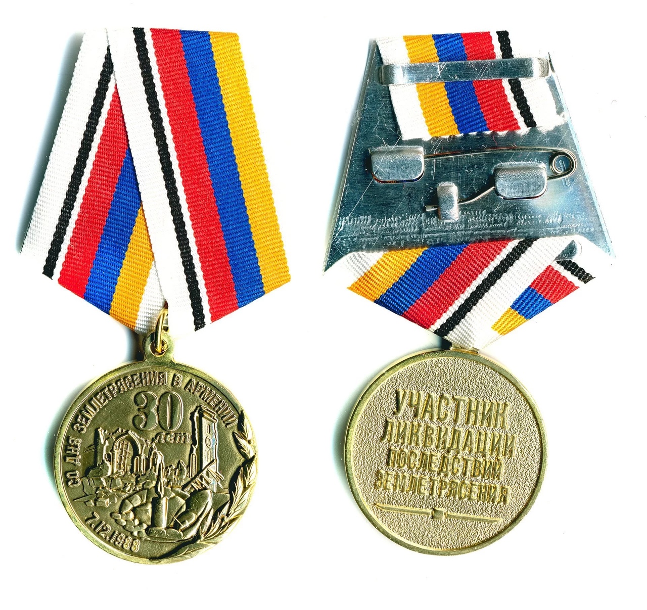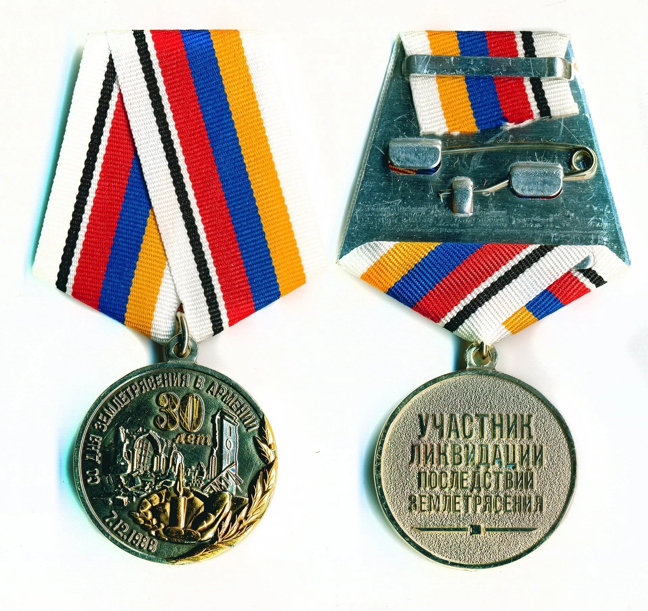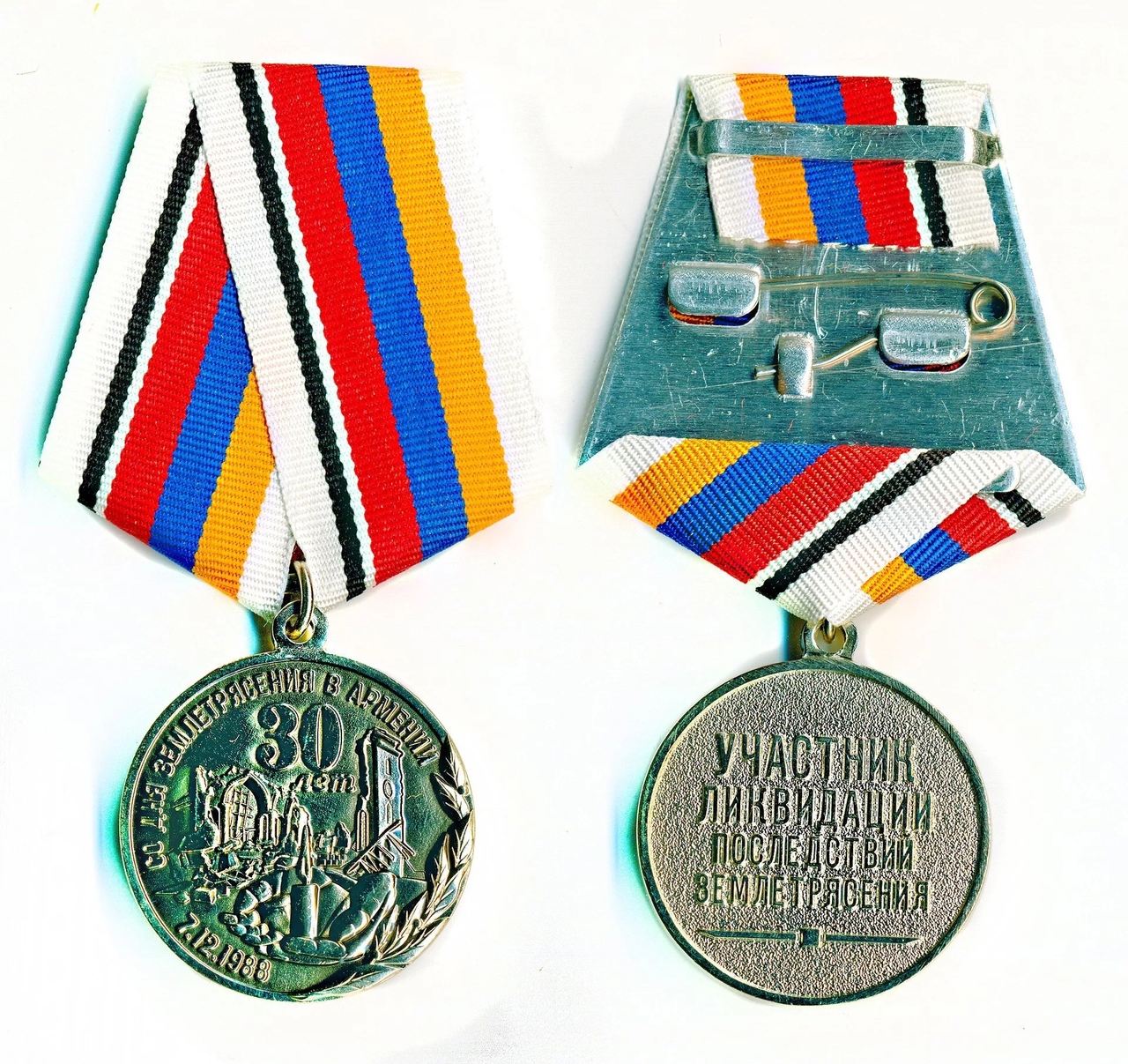 На изображении представлена медаль, посвященная 30-летию землетрясения в Армении, произошедшего 7 декабря 1988 года. Медаль изготовлена из металла и имеет круглую форму. На лицевой стороне изображены архитектурные элементы, символизирующие разрушенные здания, а также лавровая ветвь, обозначающая память и почести погибшим. Вокруг изображения расположена надпись на русском языке: "30 лет СО ДНЯ ЗЕМЛЕТРЯСЕНИЯ В АРМЕНИИ 7.12.1988". На оборотной стороне медали выгравирована надпись: "УЧАСТНИК ЛИКВИДАЦИИ ПОСЛЕДСТВИЙ ЗЕМЛЕТРЯСЕНИЯ". Медаль прикреплена к ленте, состоящей из полос белого, черного, красного, синего и желтого цветов. Лента закреплена с помощью металлической застежки.