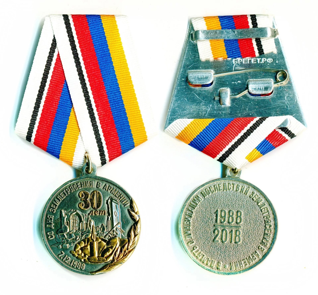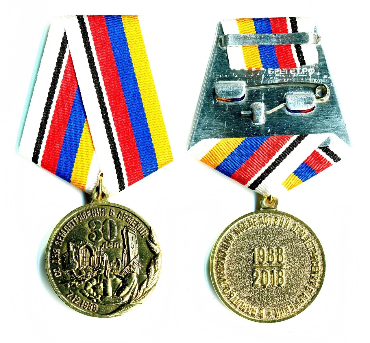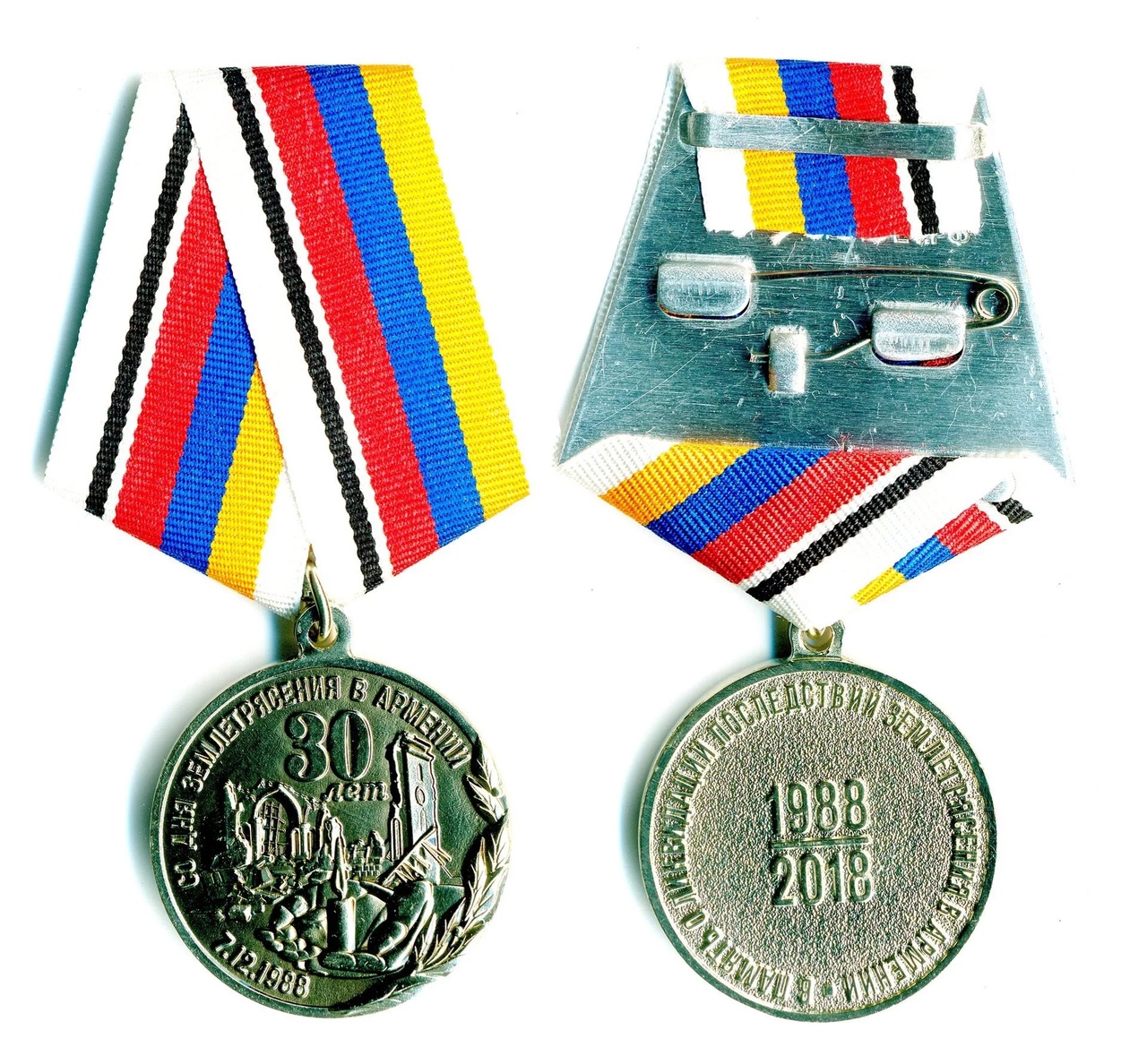 На изображении представлена медаль, посвященная 30-летию землетрясения в Армении, произошедшего 7 декабря 1988 года. Медаль изготовлена из металла и имеет круглую форму. На лицевой стороне изображены архитектурные элементы, символизирующие разрушенные здания, а также лавровая ветвь, обозначающая память и почести погибшим. Вокруг изображения расположена надпись на русском языке: "30 лет СО ДНЯ ЗЕМЛЕТРЯСЕНИЯ В АРМЕНИИ 7.12.1988". На оборотной стороне медали выгравирована надпись: "УЧАСТНИК ЛИКВИДАЦИИ ПОСЛЕДСТВИЙ ЗЕМЛЕТРЯСЕНИЯ". Медаль прикреплена к ленте, состоящей из полос белого, черного, красного, синего и желтого цветов. Лента закреплена с помощью металлической застежки.