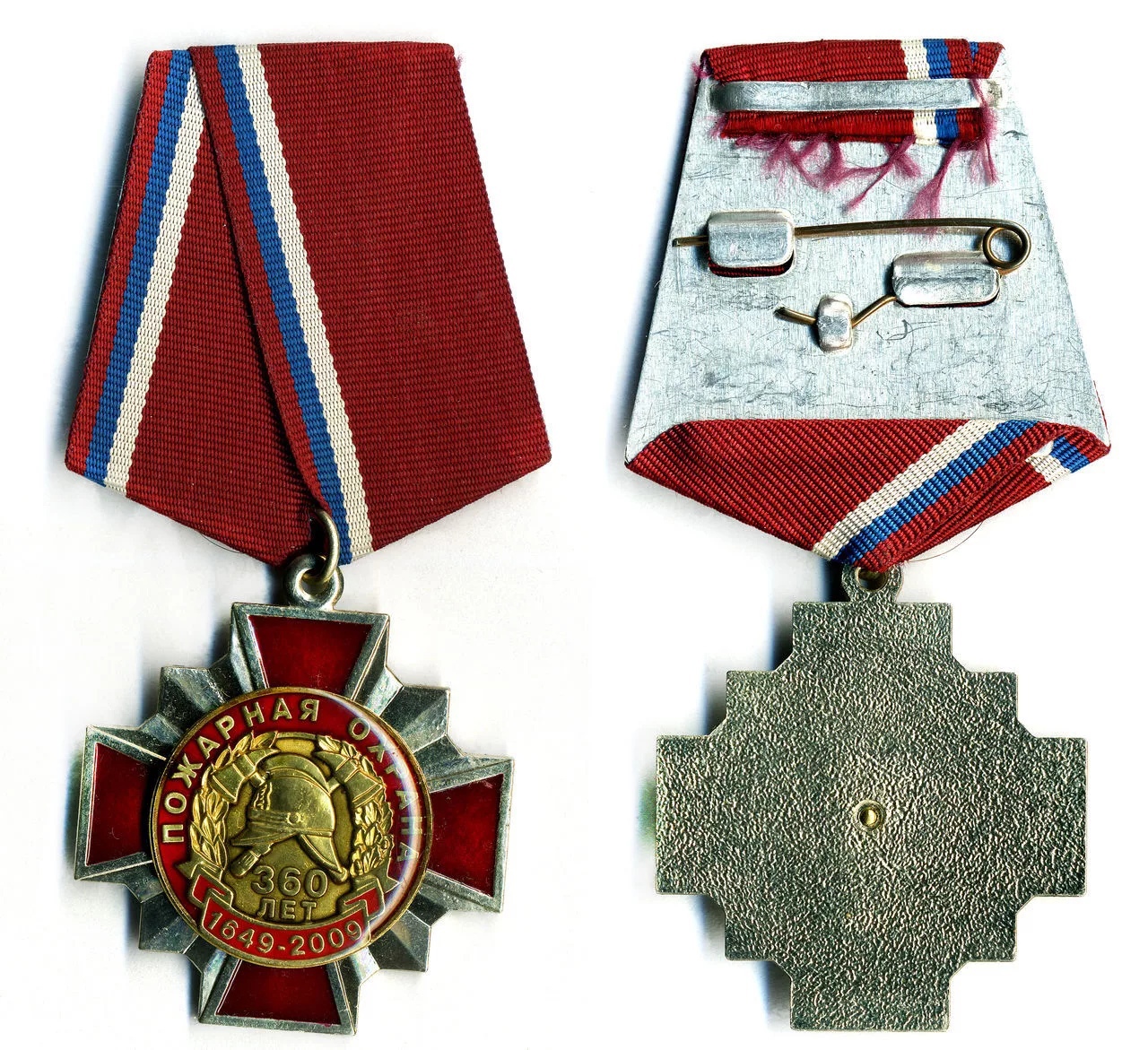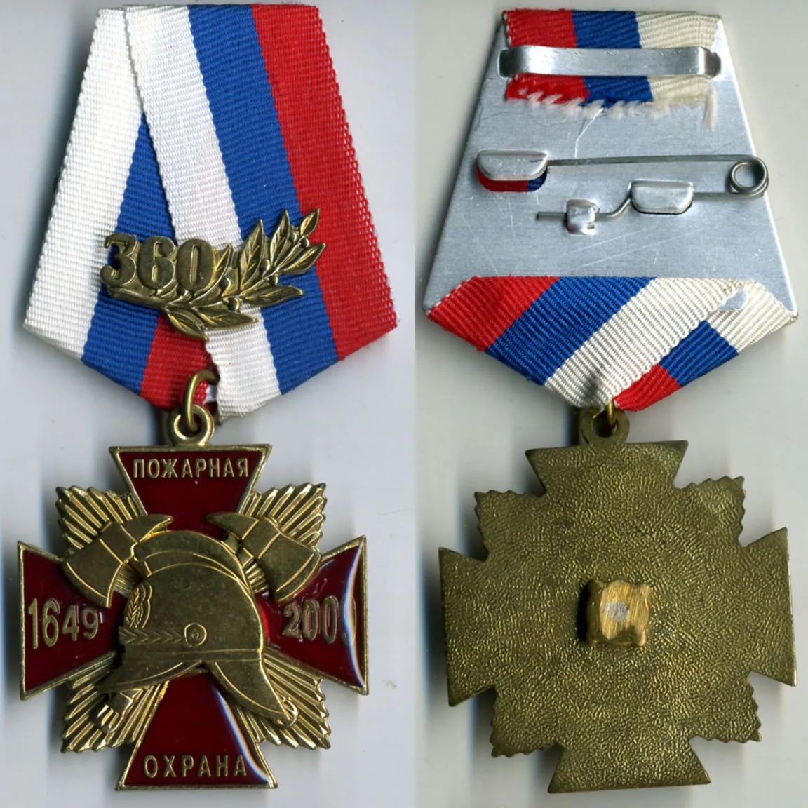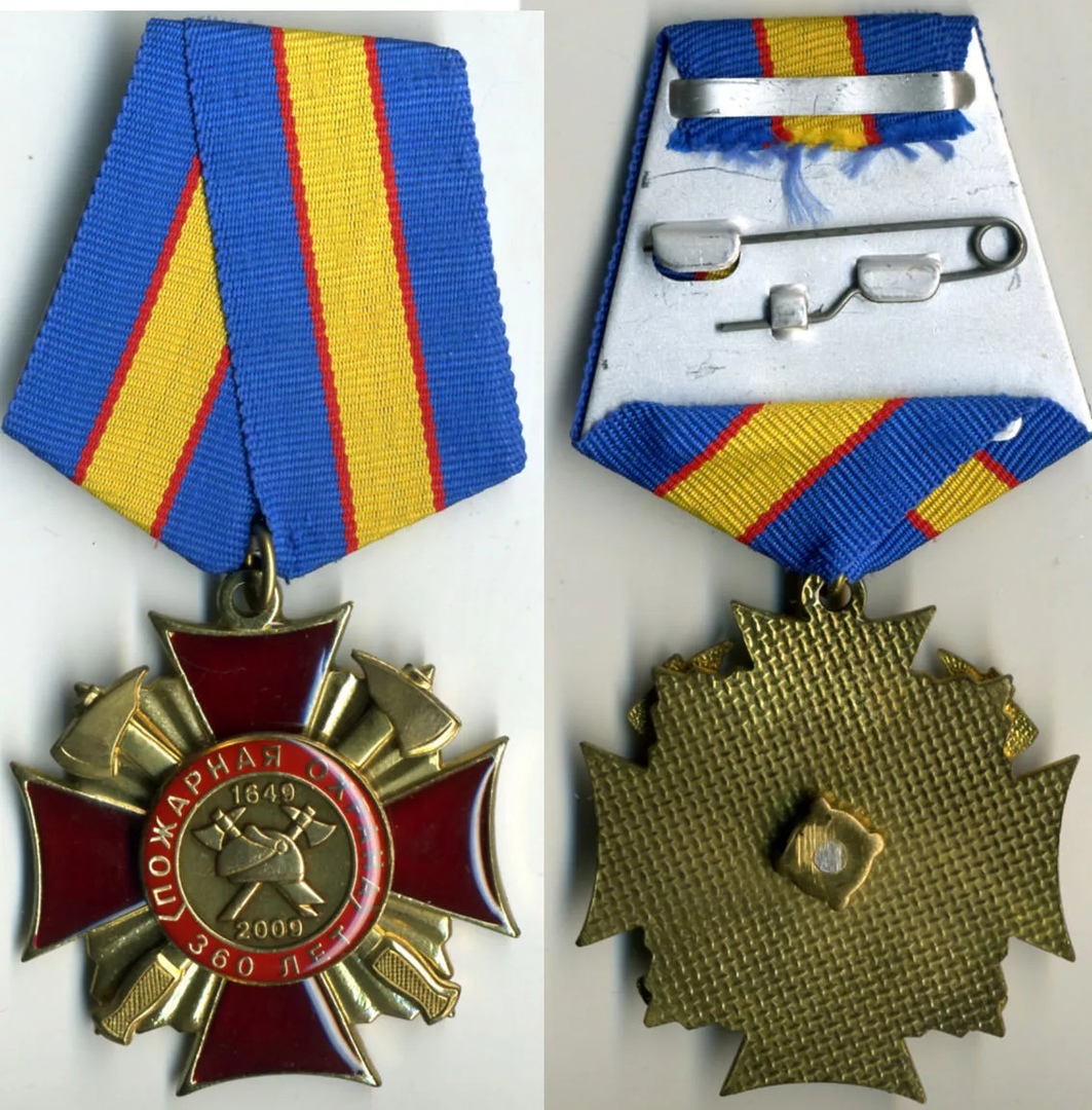 На изображении представлена медаль, посвященная 360-летию пожарной охраны, выпущенная в 2009 году. Медаль имеет форму креста с красными и золотыми элементами. В центре креста изображены скрещенные топоры и каска, символизирующие пожарную службу. Вокруг центрального изображения расположена надпись "ПОЖАРНАЯ ОХРАНА 1849-2009 360 ЛЕТ". Лента медали состоит из синего, желтого и красного цветов. На обратной стороне медали изображена текстурированная поверхность с застежкой для крепления. Медаль выполнена из металла и эмали.