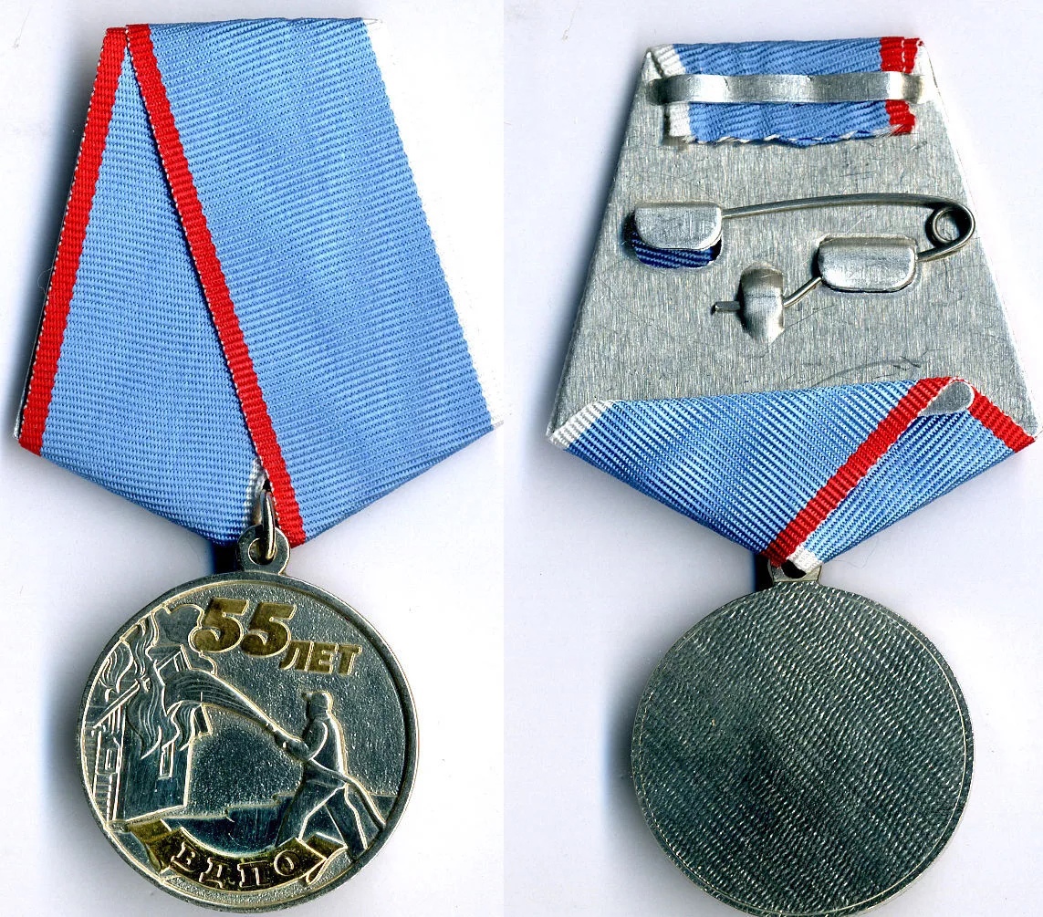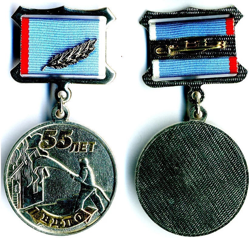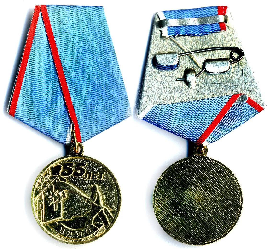 На изображении представлена медаль, посвященная 55-летию ВДПО (Всероссийское добровольное пожарное общество). Медаль изготовлена из металла и имеет круглую форму. На лицевой стороне изображен пожарный, тушащий пламя, вырывающееся из окна здания. В верхней части медали выбита надпись "55 ЛЕТ", а в нижней части - аббревиатура "ВДПО". На оборотной стороне медали отсутствуют какие-либо изображения или надписи, поверхность имеет мелкую текстуру.