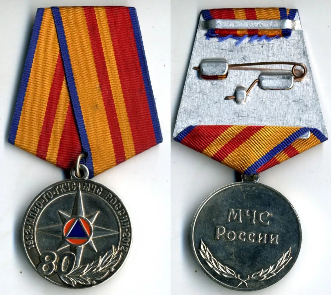 На изображении представлена медаль, посвященная 80-летию МПВО-ГО-ГКЧС-МЧС России. Медаль изготовлена из металла и имеет круглую форму. На лицевой стороне изображена восьмиконечная звезда с центральным элементом в виде треугольника, окрашенного в красный и синий цвета. Вокруг звезды расположена надпись "1932-2012 МПВО-ГО-ГКЧС-МЧС России", а в нижней части медали изображены лавровые ветви и цифра "80". На оборотной стороне медали выгравировано "МЧС России" и также изображены лавровые ветви. Медаль прикреплена к ленте, состоящей из чередующихся полос красного, желтого и синего цветов. Лента закреплена на металлической планке с булавкой для крепления к одежде.