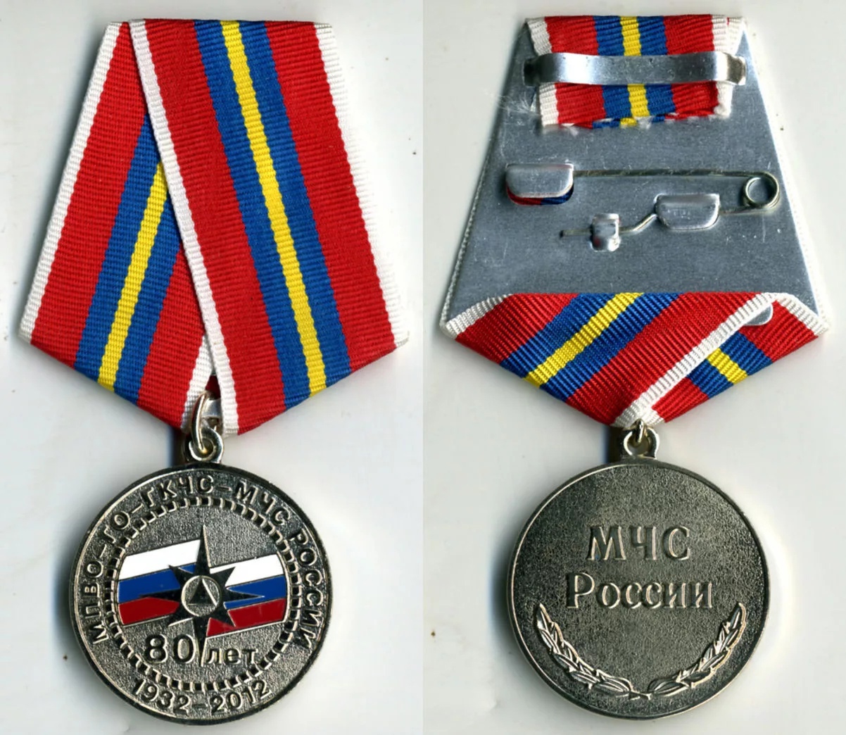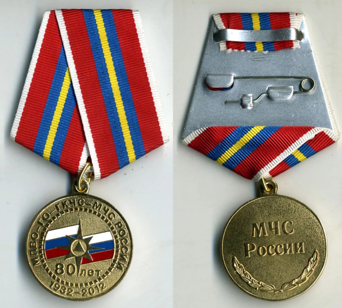 На изображении представлена медаль, посвященная 80-летию МПВО-ГО-ГКЧС-МЧС России. Медаль изготовлена из металла и имеет круглую форму. На лицевой стороне изображена восьмиконечная звезда с красным и синим треугольником в центре, окруженная надписью "80 лет МПВО-ГО-ГКЧС-МЧС России". В нижней части медали изображены лавровые ветви и цифра "80". На оборотной стороне медали выгравировано "МЧС России" и также изображены лавровые ветви. Медаль прикреплена к ленте, состоящей из трех вертикальных полос красного, желтого и синего цветов. На обратной стороне ленты имеется металлическая застежка для крепления медали к одежде.