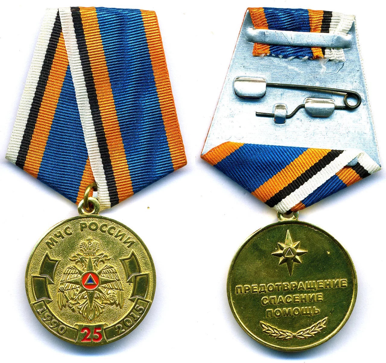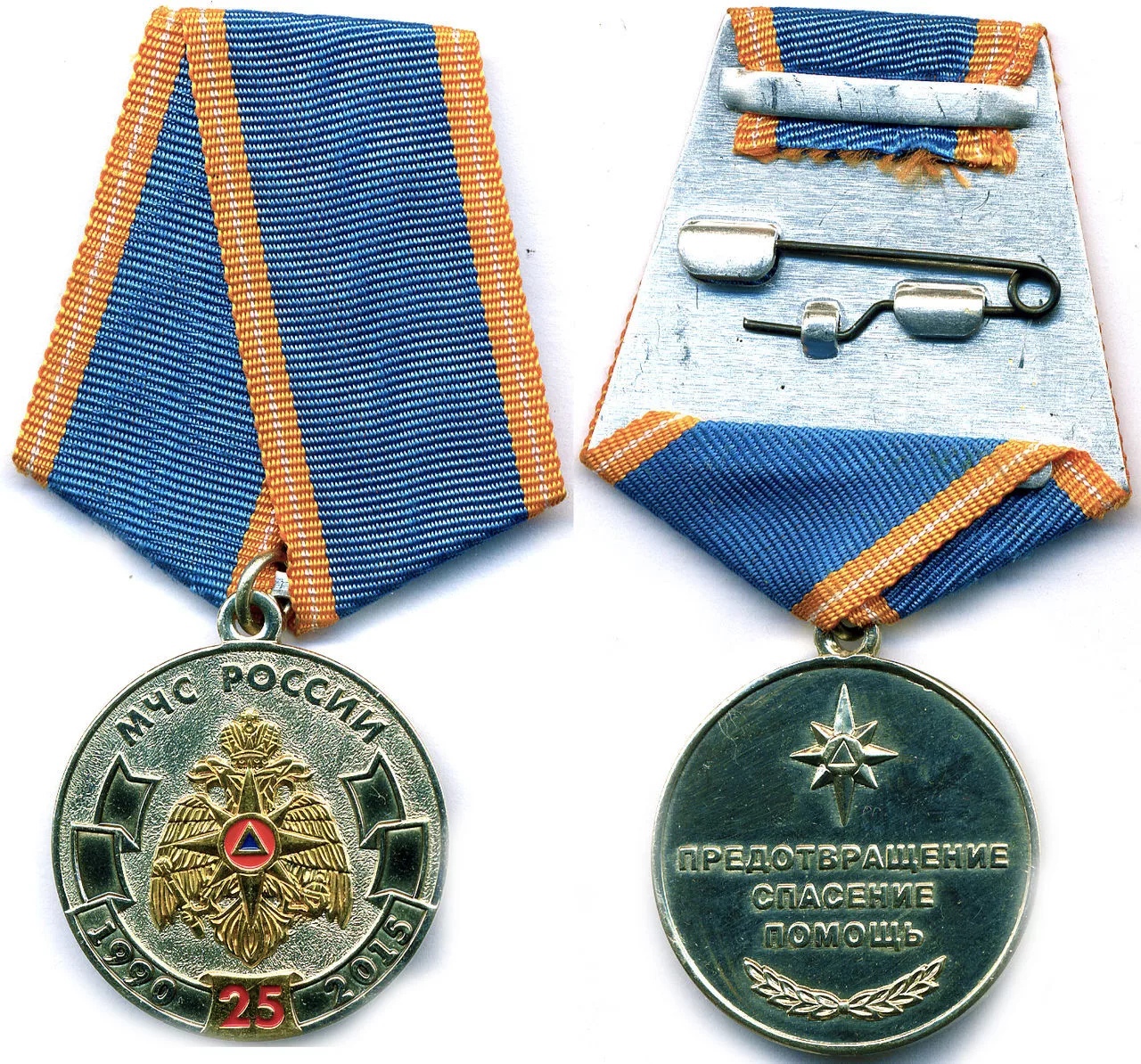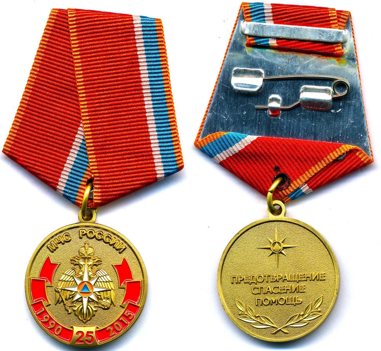 На изображении представлена медаль, посвященная 25-летию МЧС России (1990-2015). Медаль изготовлена из металла и имеет круглую форму. На лицевой стороне изображен герб России, окруженный лавровыми ветвями и стилизованными лучами. В центре герба расположен красный треугольник с синим кругом внутри. Вокруг герба надпись "МЧС РОССИИ" и годы "1990-2015". В нижней части медали красным цветом выделена цифра "25".