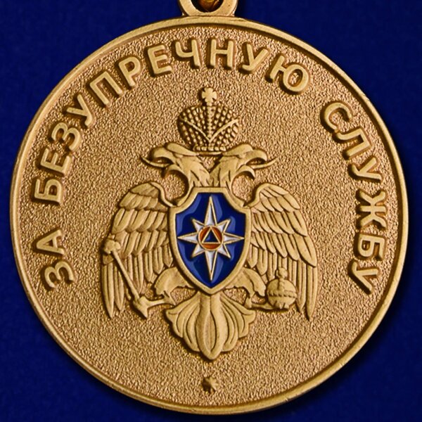 Медаль МЧС России «За безупречную службу» (далее - медаль) представляет собой круг золотистого цвета диаметром 32 мм с выпуклым бортиком с обеих сторон.