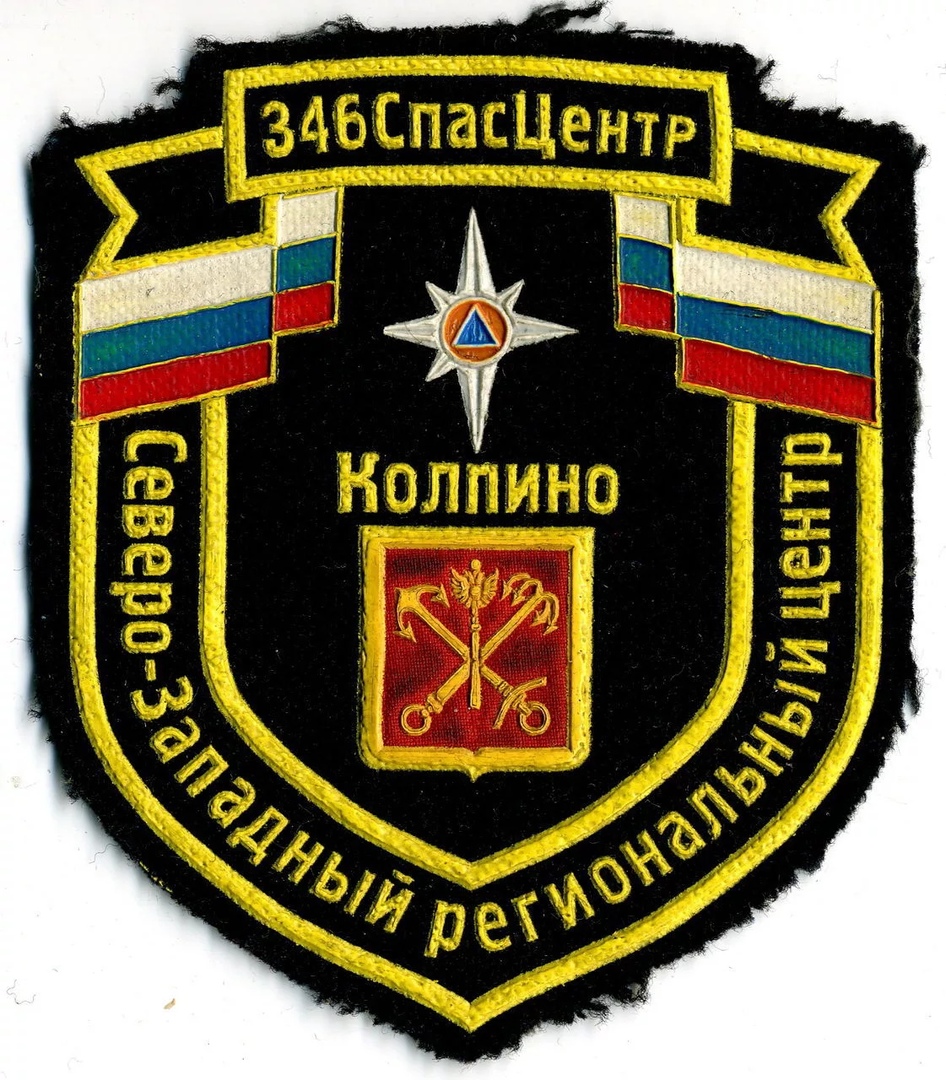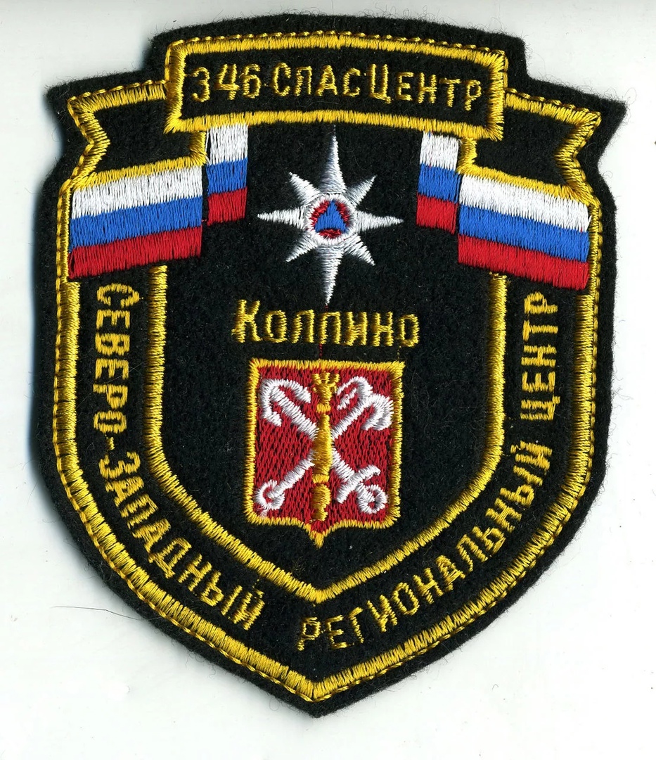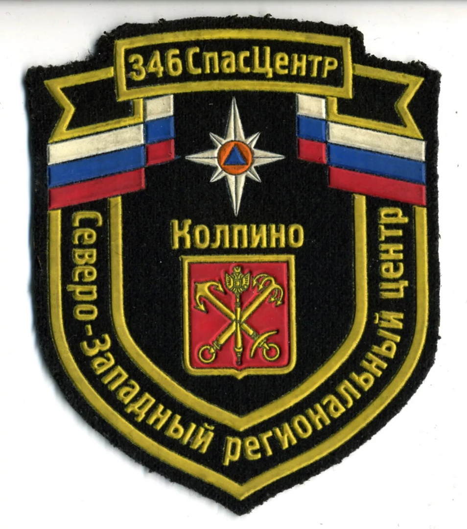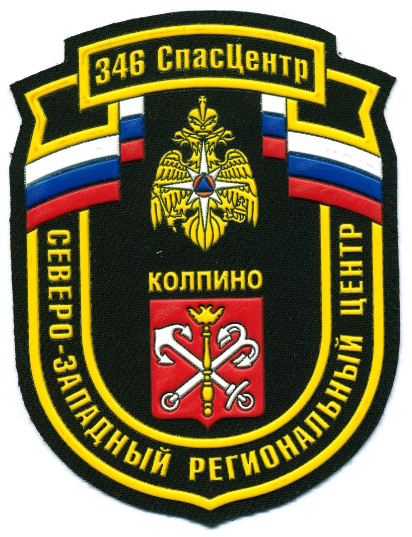 Нашивка "346 СПАСЦЕНТР СевЗап РЦ КОЛПИНО 1" выполнена из ткани и имеет форму щита с золотой окантовкой. В верхней части изображена двуглавый орел с короной, держащий в лапах меч и скипетр, а также звезду с красным центром. Под орлом расположена надпись "КОЛПИНО". В нижней части на красном фоне изображены две скрещенные золотые ключи. По бокам нашивки начертаны надписи "СЕВЕРО-ЗАПАДНЫЙ РЕГИОНАЛЬНЫЙ ЦЕНТР". В верхней части нашивки изображены флаги России. Основные цвета нашивки - черный, золотой, красный, синий и белый.
