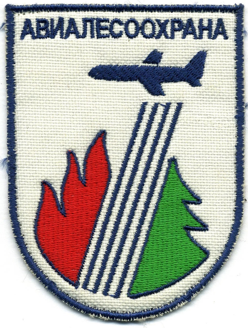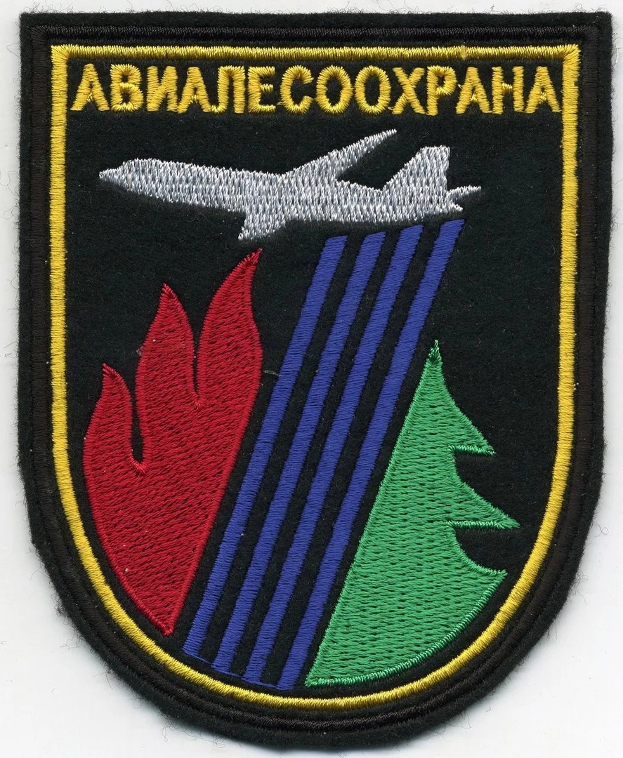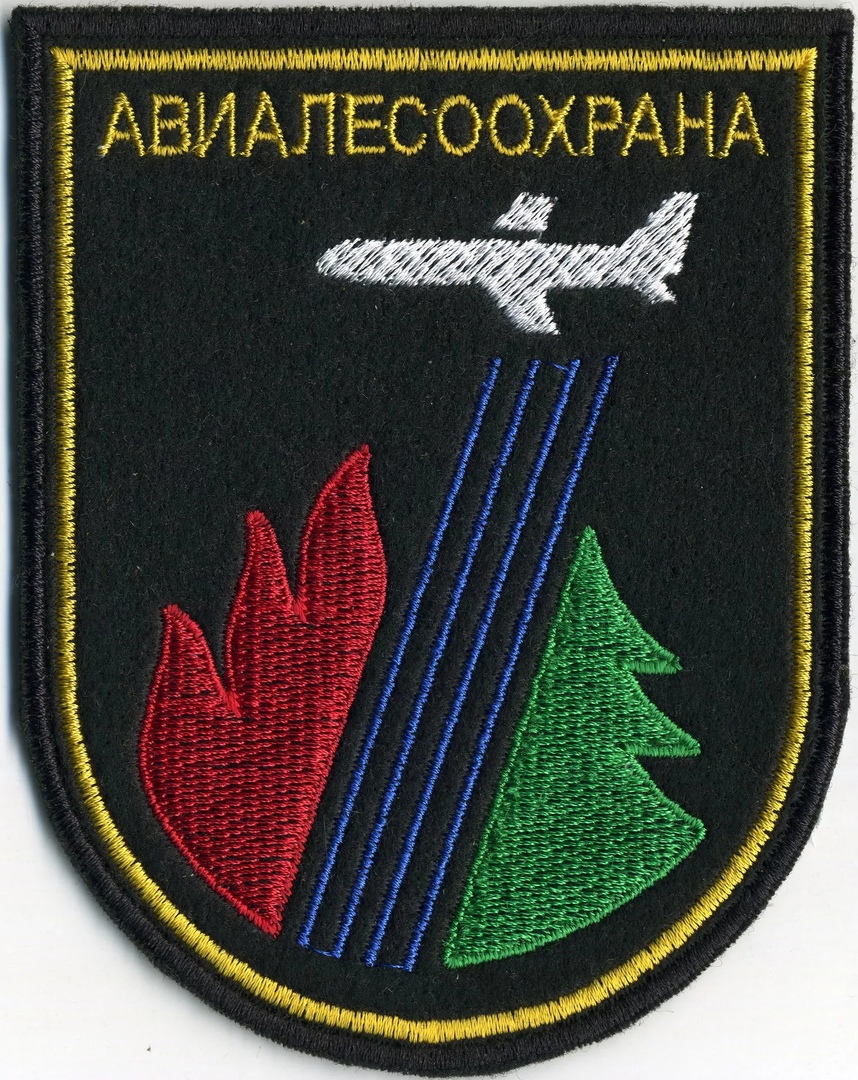 Это коллекция из трех нашивок, связанных с авиационной охраной лесов. На каждой нашивке изображен самолет, летящий над стилизованными языками пламени и зеленой елью. Над изображением самолета расположена надпись "АВИАЛЕСООХРАНА" желтым цветом на черном фоне. Нашивки отличаются цветом фона: первая имеет темно-зеленый фон, вторая - коричневый, а третья - черный. Все нашивки имеют желтую окантовку. Материал нашивок, вероятно, текстиль, что характерно для подобных изделий.