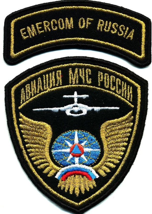 На изображении представлены две нашивки, связанные с авиацией МЧС России. Верхняя нашивка имеет форму прямоугольника с закругленными углами и содержит надпись "EMERCOM OF RUSSIA" серебристого цвета на синем фоне. Нижняя нашивка имеет форму щита и также выполнена в синем цвете с серебристой окантовкой. В центре нашивки изображен самолет, летящий над земным шаром, который окружен крыльями. Под земным шаром расположен стилизованный элемент, напоминающий языки пламени, выполненный в красном, белом и синем цветах. В верхней части щита надпись "АВИАЦИЯ МЧС" также серебристого цвета. Обе нашивки выполнены из ткани с вышивкой, что придает им прочность и долговечность.