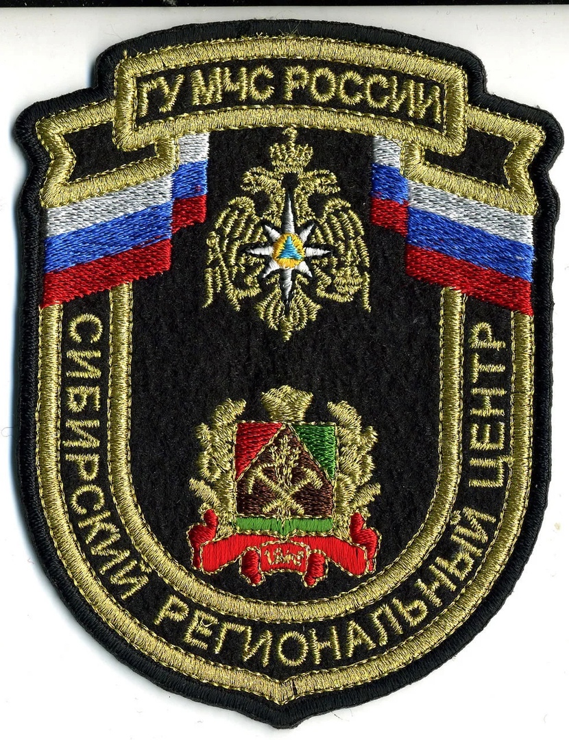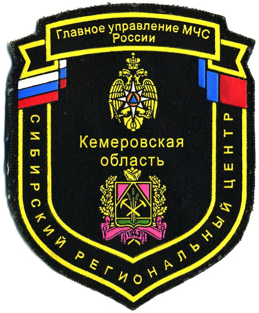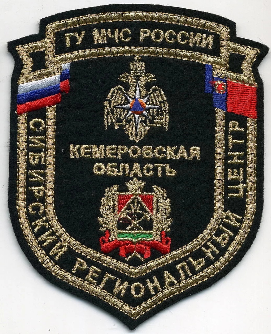 Нашивка представляет собой эмблему Главного управления МЧС России по Кемеровской области. Она выполнена в форме щита с золотым контуром. В верхней части нашивки изображены флаги России и Кемеровской области. В центре расположен герб России, а под ним надпись "КЕМЕРОВСКАЯ ОБЛАСТЬ". Ниже герба изображен региональный герб Кемеровской области. По краям нашивки вышита надпись "СИБИРСКИЙ РЕГИОНАЛЬНЫЙ ЦЕНТР". Цвета нашивки включают черный фон, золотые и красные элементы, а также цвета флагов. Материал нашивки, вероятно, текстиль, так как она выглядит как вышивка.