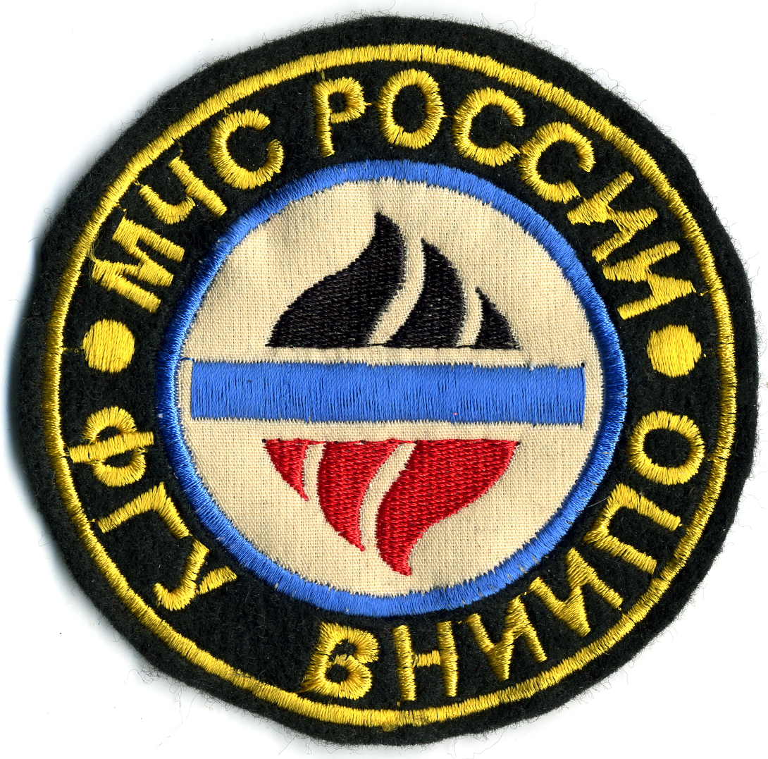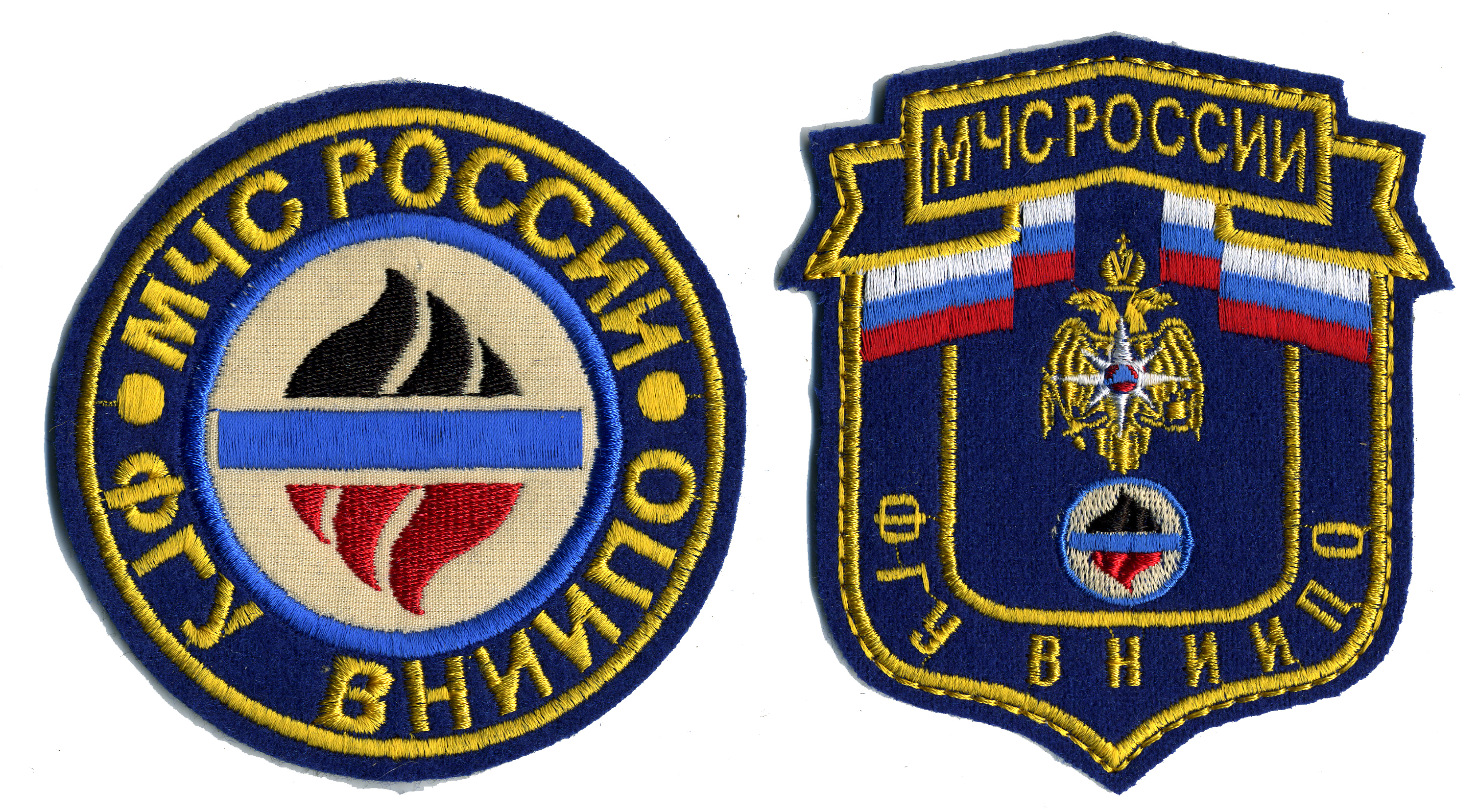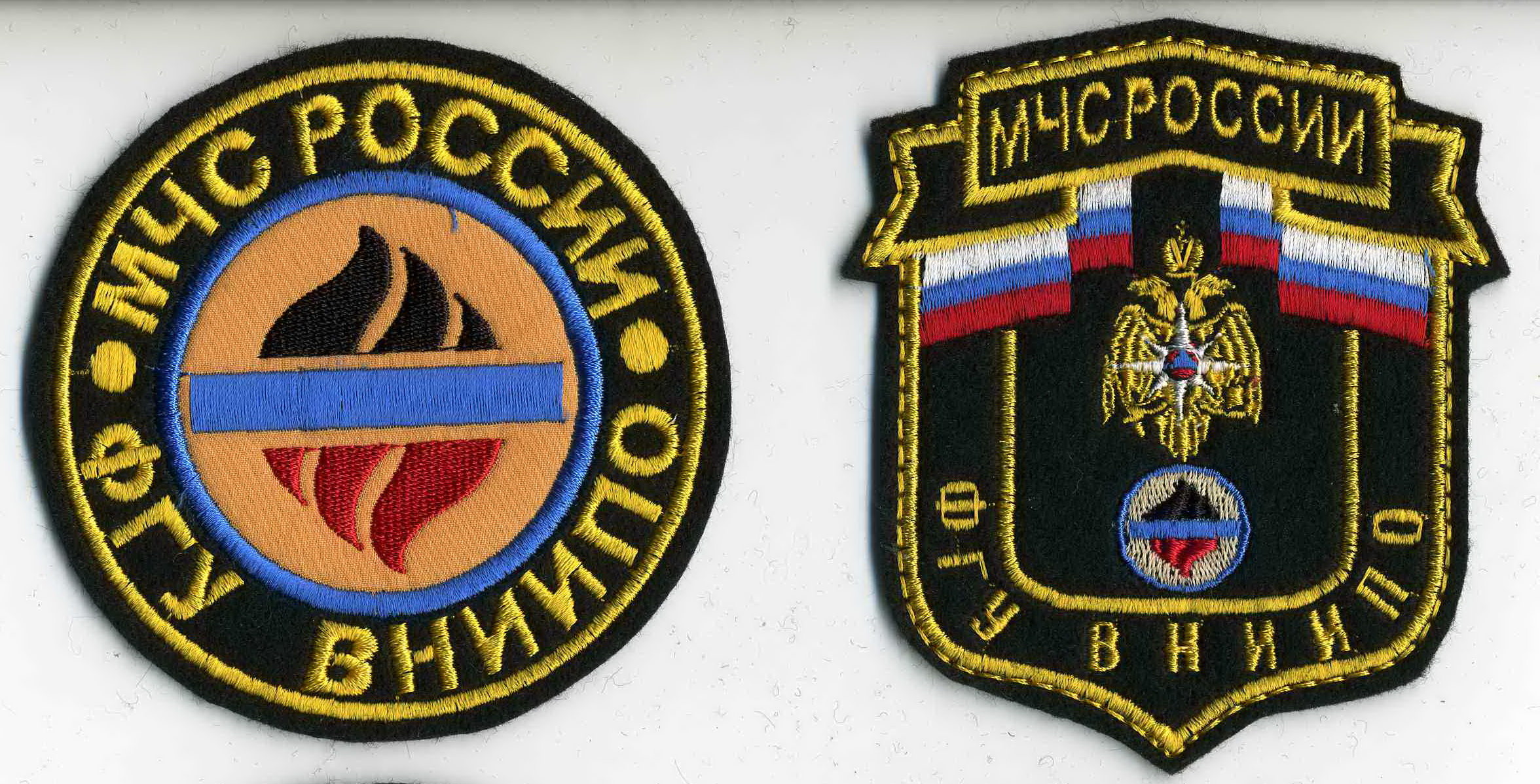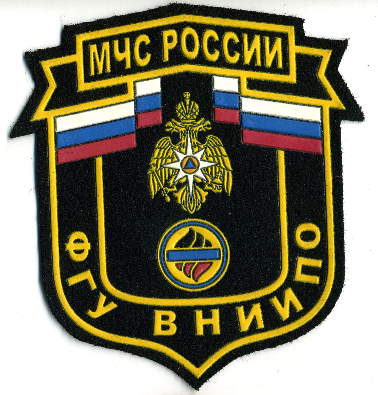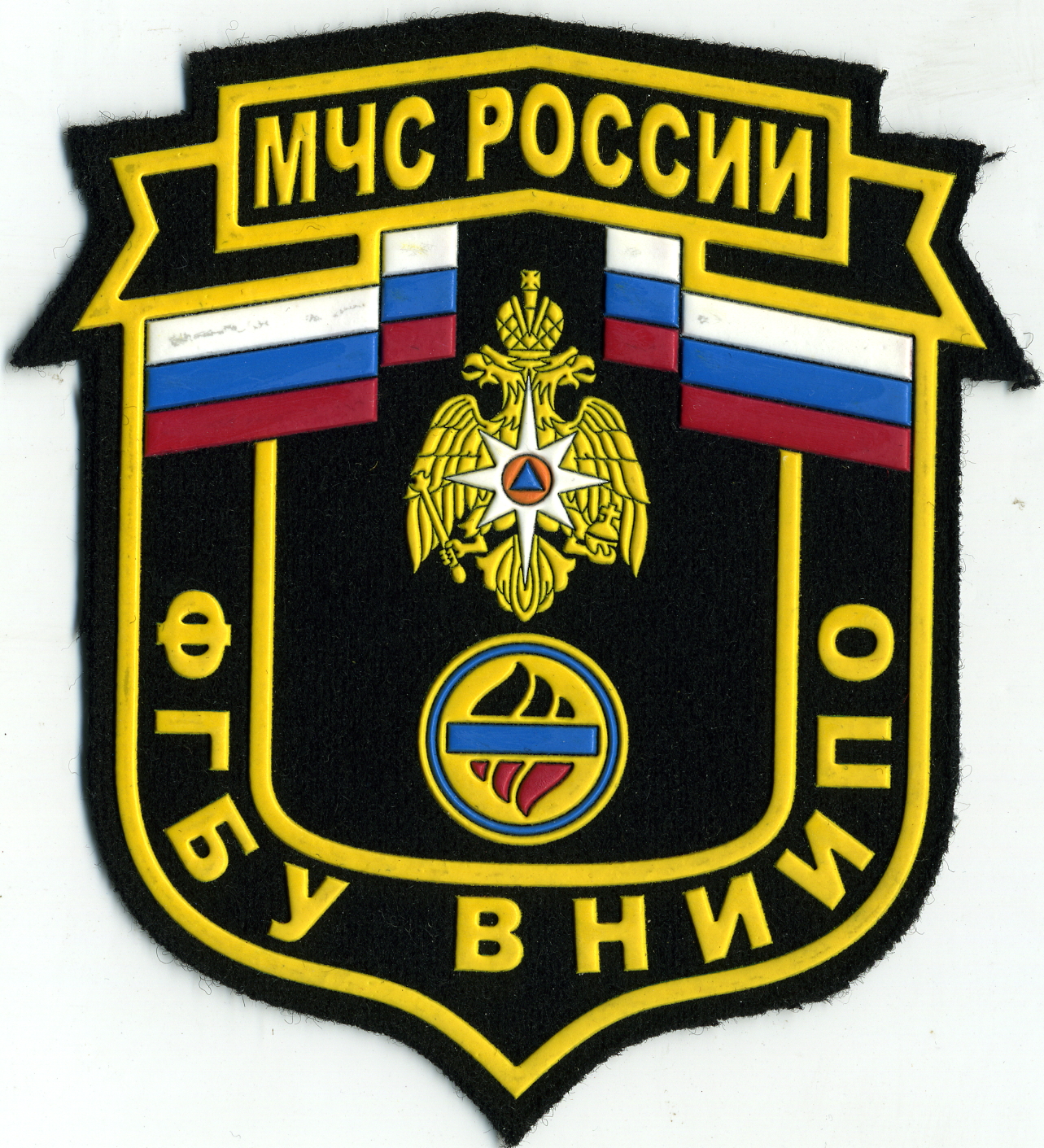 Нашивка выполнена в зеленом цвете с желтой окантовкой. В верхней части нашивки надпись "МЧС РОССИИ" выполнена желтыми нитями. В нижней части нашивки также желтыми нитями вышита аббревиатура "ФГБУ ВНИИПО", что означает Федеральное государственное бюджетное учреждение "Всероссийский научно-исследовательский институт противопожарной обороны".
