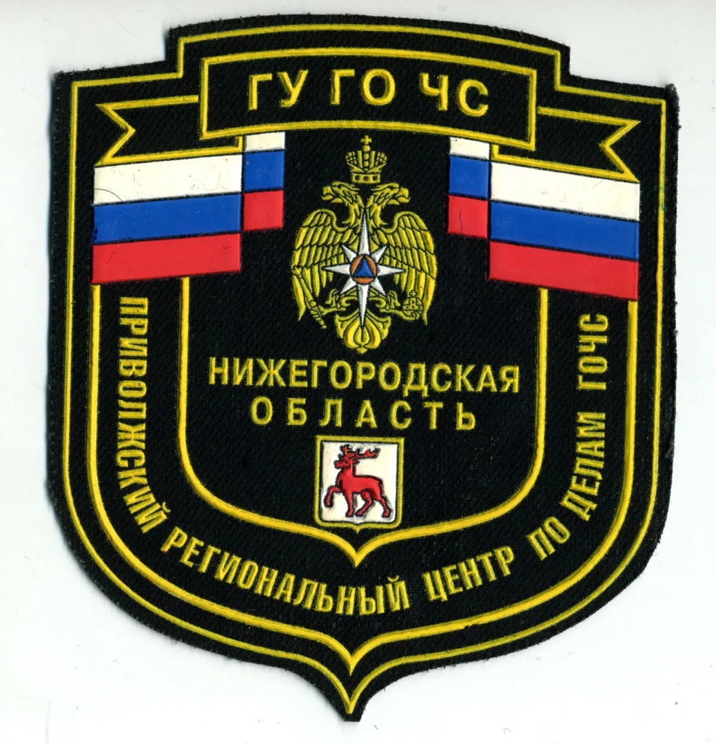 Нашивка представляет собой эмблему Главного управления по делам гражданской обороны и чрезвычайных ситуаций Нижегородской области. В центре нашивки изображен двуглавый орел с короной, держащий в лапах символы власти и защиты. На груди орла расположена звезда с вписанным в нее щитом, на котором изображен красный олень на белом фоне. По обе стороны от орла расположены флаги Российской Федерации. В верхней части нашивки надпись "ГУ ГО ЧС", а в нижней части - "Нижегородская область". По краям нашивки вышита надпись "Приволжский региональный центр по делам ГОЧС". Нашивка выполнена в черном, золотом, красном, белом и синем цветах. Материал нашивки - ткань с вышивкой.