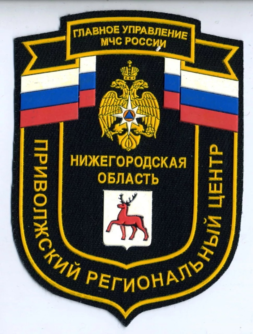 На изображении представлены два одинаковых нашивки, относящиеся к Главному управлению МЧС России по Нижегородской области. Нашивки имеют форму щита и выполнены в черном цвете с золотой окантовкой. В центре нашивки изображен золотой двуглавый орел – государственный символ России, увенчанный короной. На груди орла расположен щиток с изображением Святого Георгия Победоносца, поражающего змея. Под орлом начертано название региона – "НИЖЕГОРОДСКАЯ ОБЛАСТЬ". В нижней части нашивки изображен красный олень на белом фоне – герб Нижегородской области. По бокам центрального изображения расположены флаги России. В верхней части нашивки надпись "ГЛАВНОЕ УПРАВЛЕНИЕ МЧС РОССИИ", а в нижней – "ЦЕНТРАЛЬНЫЙ РЕГИОНАЛЬНЫЙ". Нашивки выполнены из ткани с вышивкой золотыми нитями.