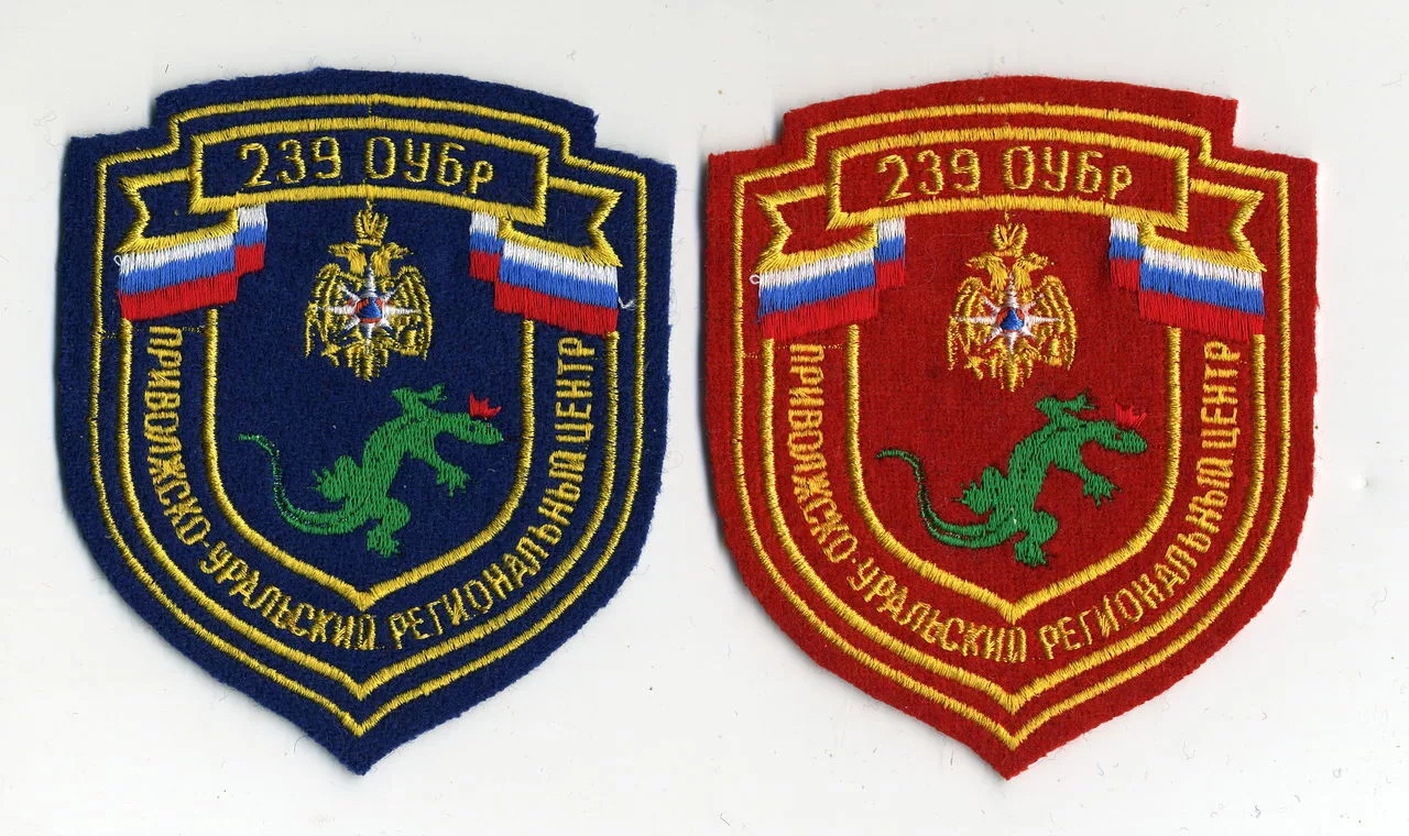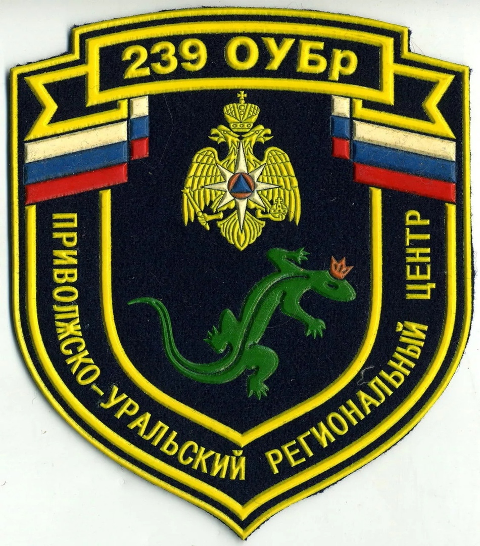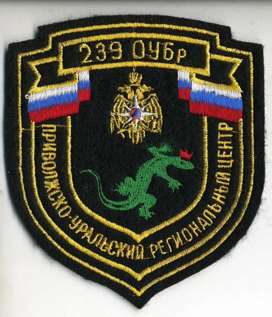 Нашивка представляет собой черный щит с золотой окантовкой. В верхней части нашивки изображены две российские флаги, расположенные по обе стороны от золотого двуглавого орла, который держит в лапах серебряный меч и щит с красным крестом. Под орлом изображен зеленый ящер с красной короной на голове. Вокруг щита золотыми буквами вышита надпись "Пр.Ур.Р.Ц. 239 ОУБр". Нашивка выполнена из плотной ткани, с использованием золотых, красных, синих, белых и зеленых нитей.