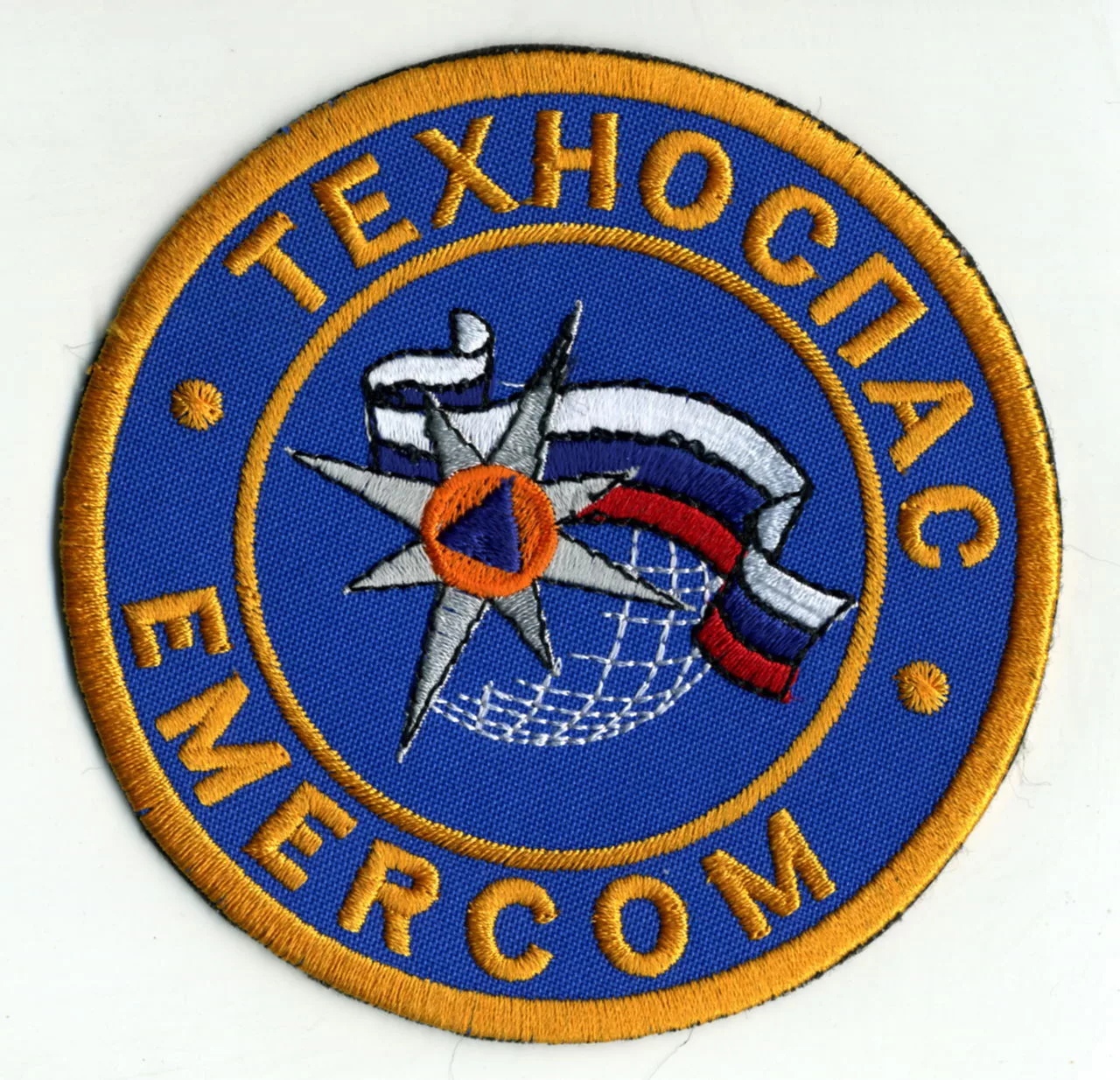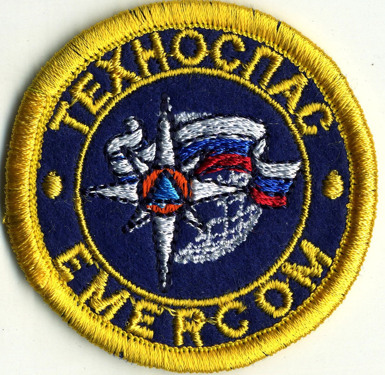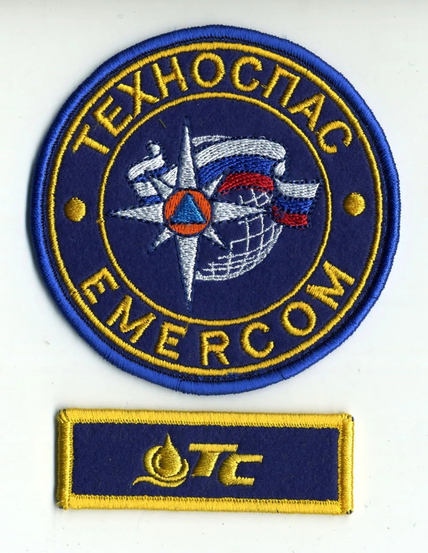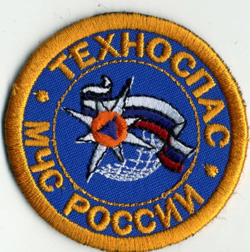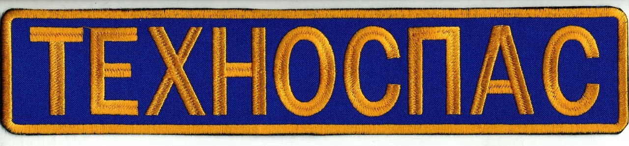Нашивка "Техноспас России" выполнена из ткани и имеет круглую форму. В центре изображена восьмиконечная звезда, обвитая лентой с цветами российского флага: белым, синим и красным. Внутри звезды расположен оранжевый круг с синим треугольником, символизирующим стремление к безопасности и защите. Под звездой изображена сеть, что может указывать на спасательные операции. Вокруг центрального изображения расположен текст "ТЕХНОСПАС РОССИИ" золотого цвета. Основной фон нашивки синий, а ободок золотой. Нашивка символизирует принадлежность к организации "Техноспас России", занимающейся ликвидацией чрезвычайных ситуаций и проведением спасательных работ.