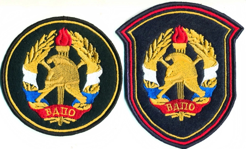 На изображении представлены две нашивки, относящиеся к Всероссийскому добровольному пожарному обществу (ВДПО). Обе нашивки имеют одинаковый дизайн, но различаются по форме: одна круглая, другая щитообразная.